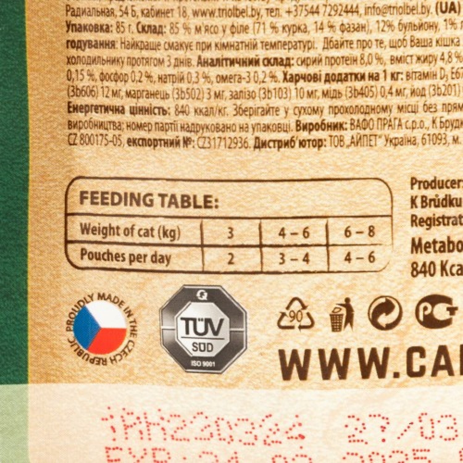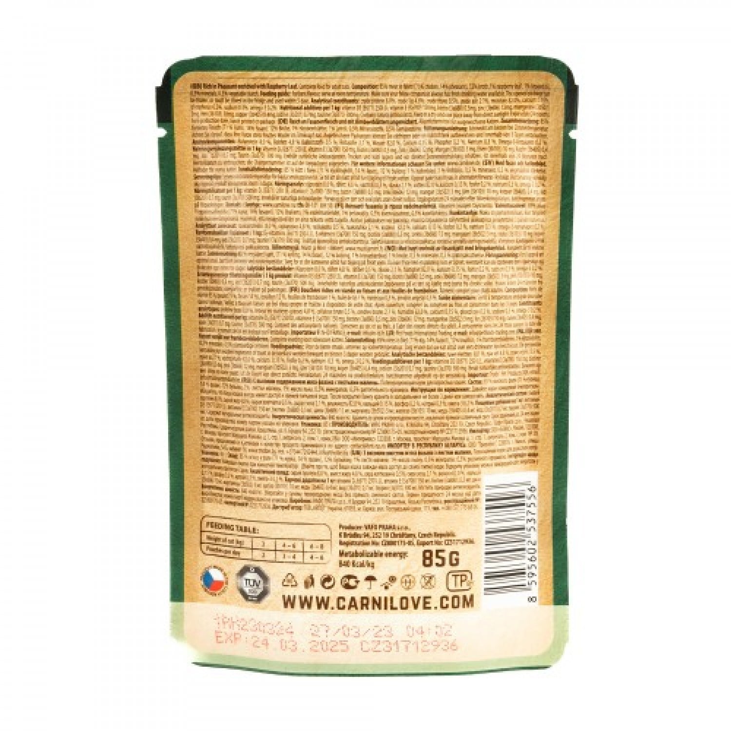 Carnilove rich in Pheasant enriched with Raspberry Leaves (филе дичи в соусе) - полноценный влажный корм класса холистик для кошек. Этот рацион можно использовать, как основное блюдо или как дополнение к сухому корму - для придания ему аппетитности.