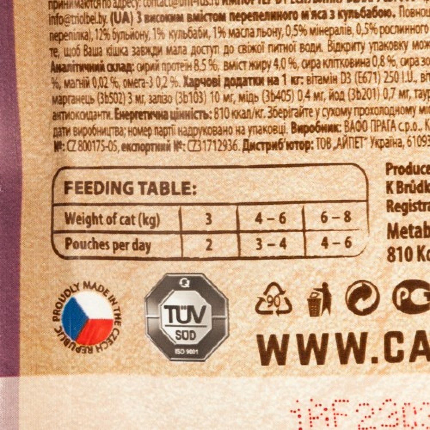 Carnilove rich in Quail enriched with Dandelion (филе дичи в соусе) - полноценный влажный корм класса холистик для кошек. Этот рацион можно использовать, как основное блюдо или как дополнение к сухому корму - для придания ему аппетитности.