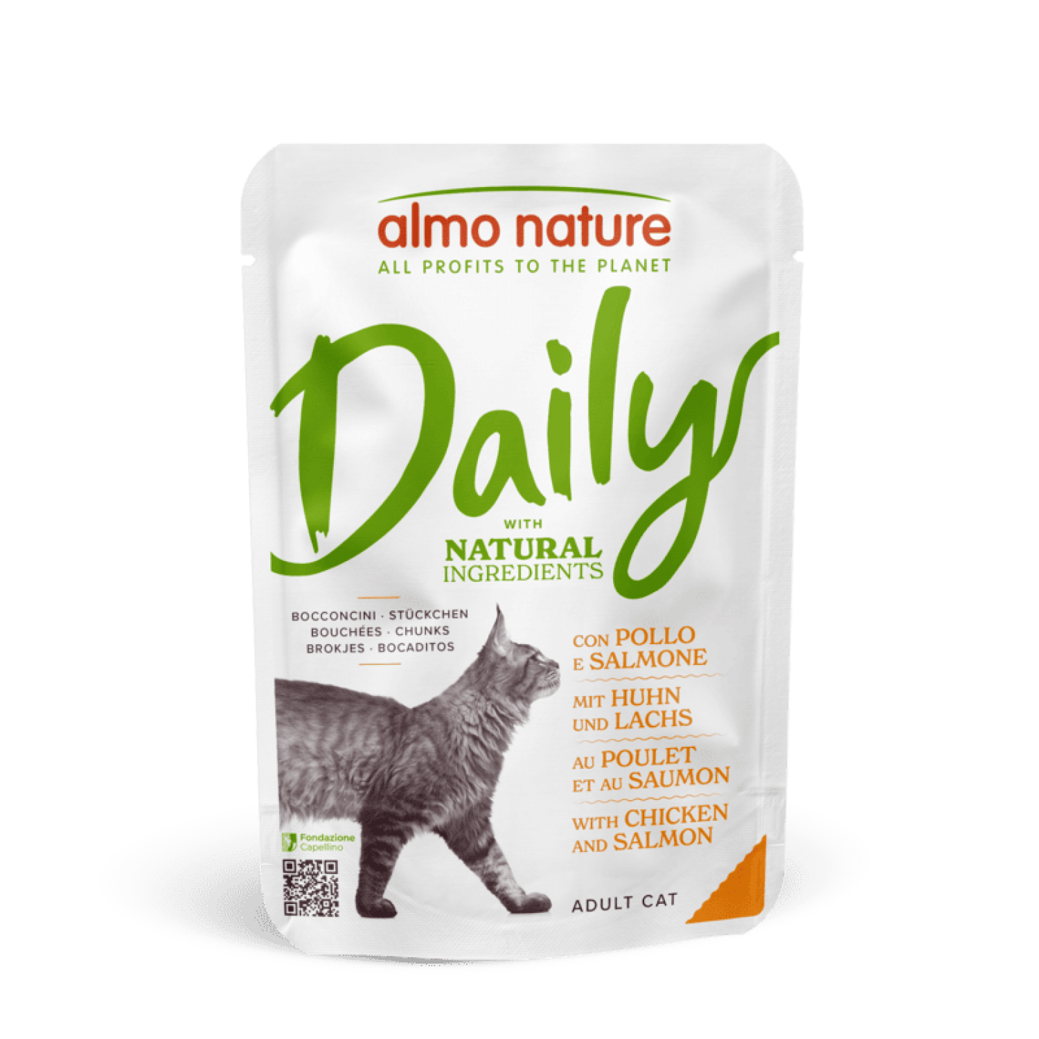 Almo Nature Daily Cat с курицей и лососем в соусе - это беззерновой влажный корм суперпремиум-класса, созданный для ежедневного кормления взрослых кошек, которые заслуживают лучшего.