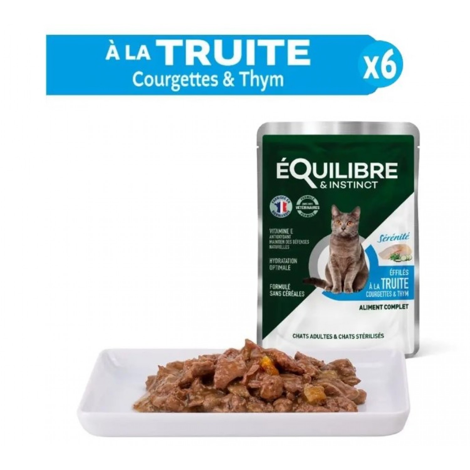 - Кусочки в соусе Equilibre & Instinct для взрослых кошек с форелью, кабачком и тимьяном.