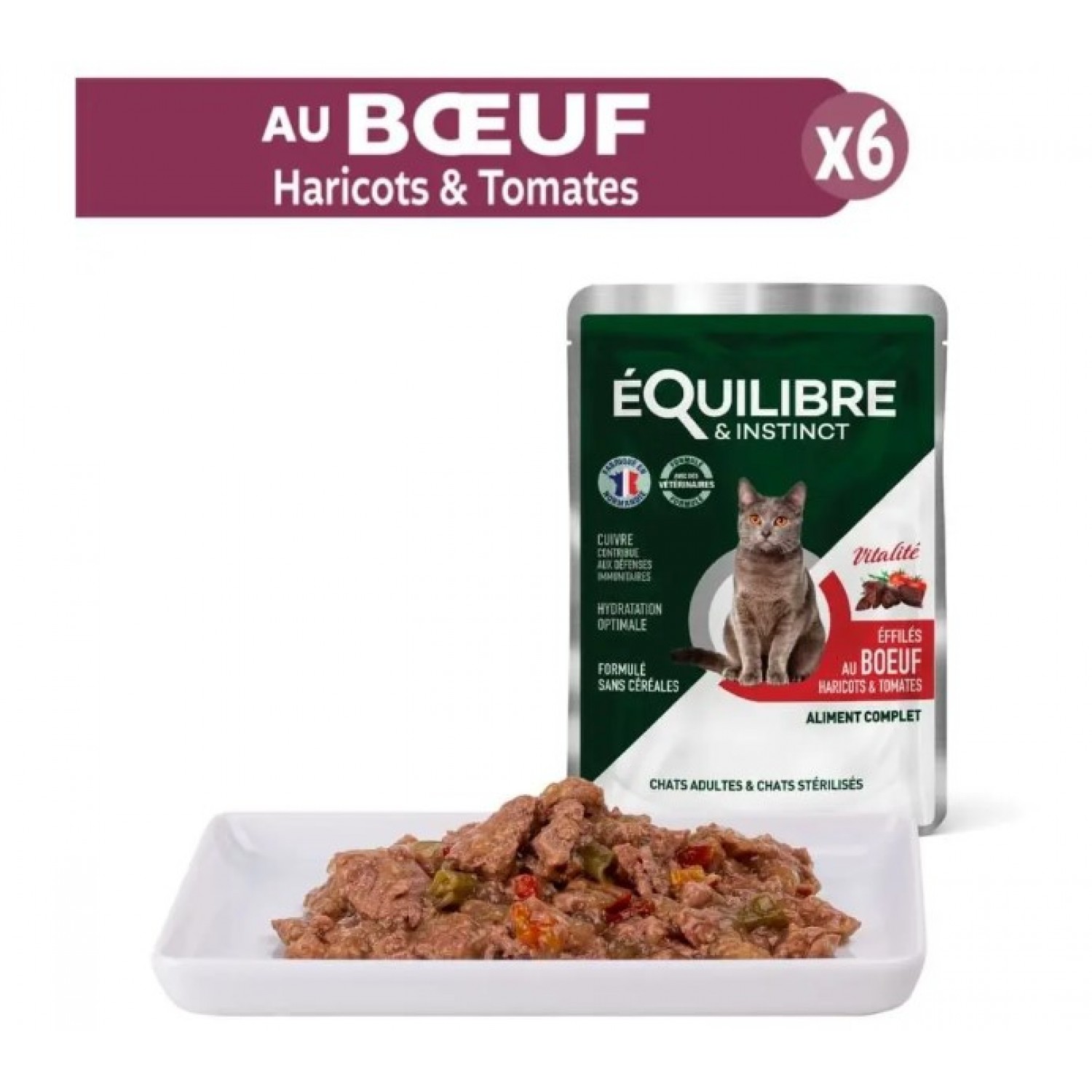 - Кусочки в соусе Equilibre & Instinct для взрослых кошек с говядиной, стручковой фасолью и томатами.