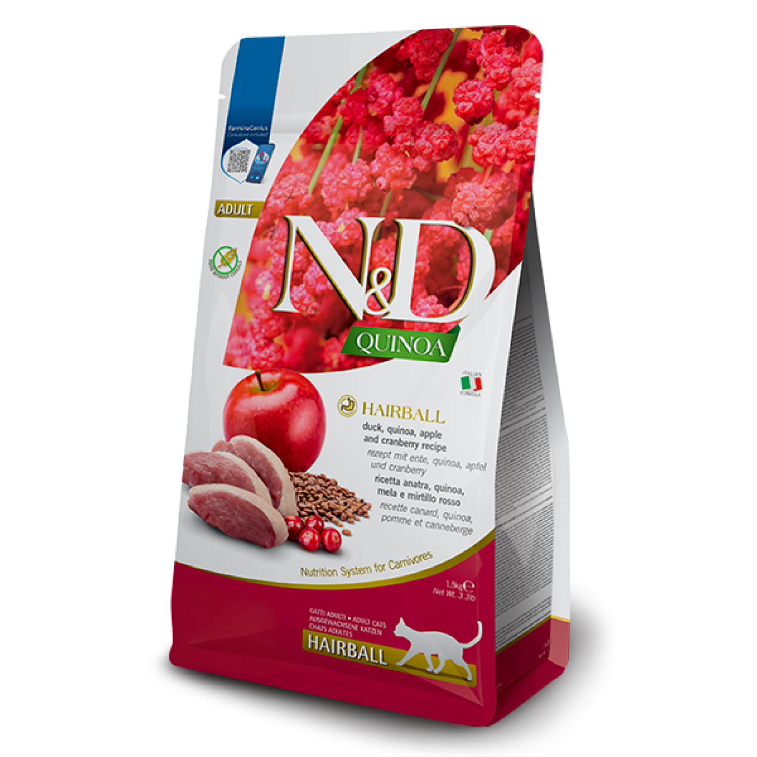 Farmina N&D Quinoa Cat Adult Hairball Duck & Apple сухой корм для выведения шерсти у котов с уткой, киноа, яблоком и клюквой.