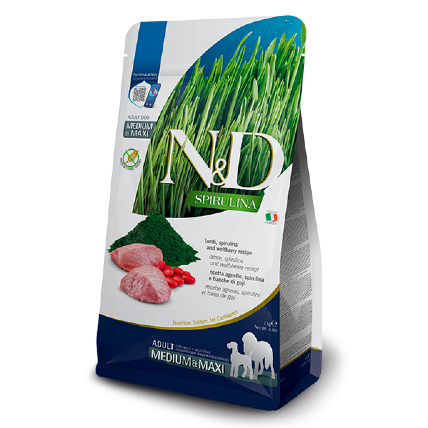 Farmina N&D Spirulina Dog Adult Medium & Maxi Lamb & Wolfberry сухой корм для собак средних и крупных пород с ягненком, спирулиной и ягодами годжи.