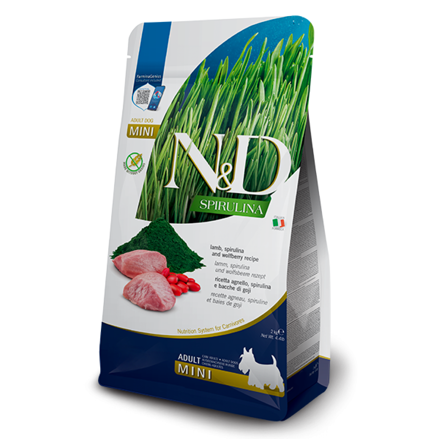 Farmina N&D Spirulina Dog Adult Mini Lamb & Wolfberry сухой корм для собак малых пород с ягненком, спирулиной и ягодами годжи.