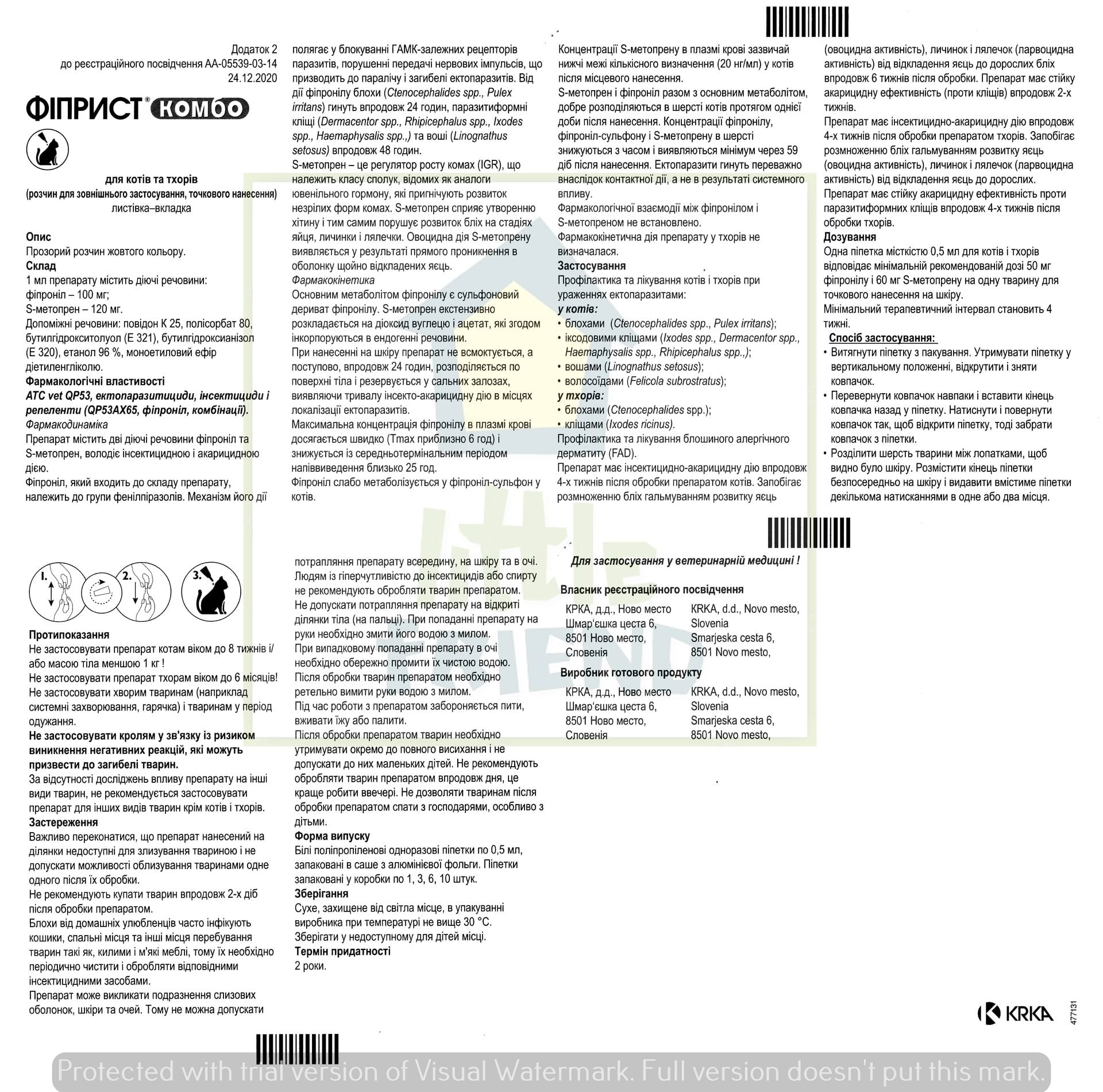 Одна пипетка емкостью 0,5 мл для кошек и хорьков соответствует минимальной рекомендуемой дозе 50 мг фипронила и 60 мг S-метопрена на одно животное для точечного нанесения на кожу.