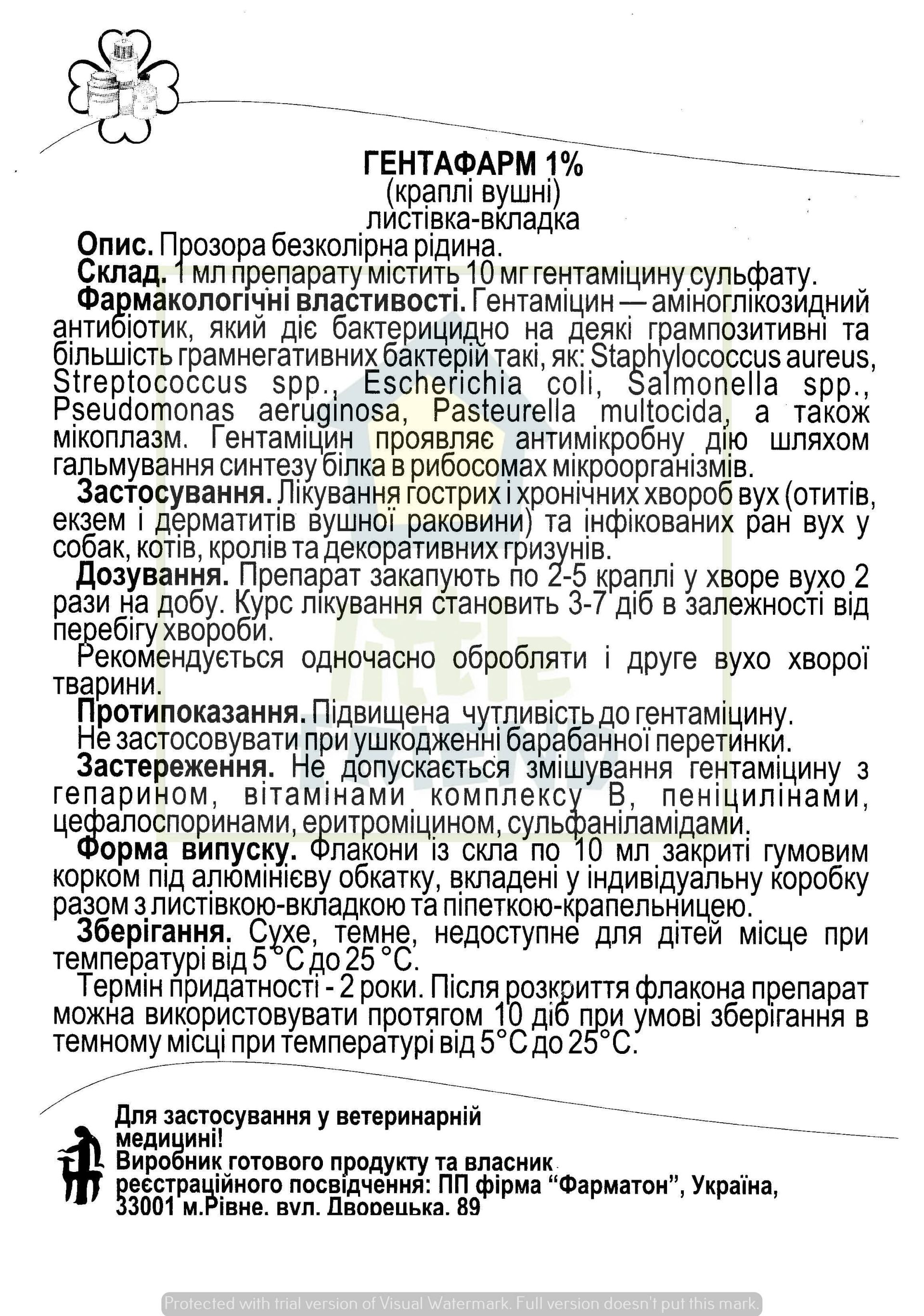 Гентамицин - аминогликозидный антибиотик, который действует бактерицидно на некоторые грамположительные и большинство грамотрицательных бактерий такие, как: Staphylococcus aureus, Streptococcus spp., Escheriсhia coli, Salmonella spp., Pseudomona. Гентамицин проявляет антимикробное действие путем торможения синтеза белка в рибосомах микроорганизмов.