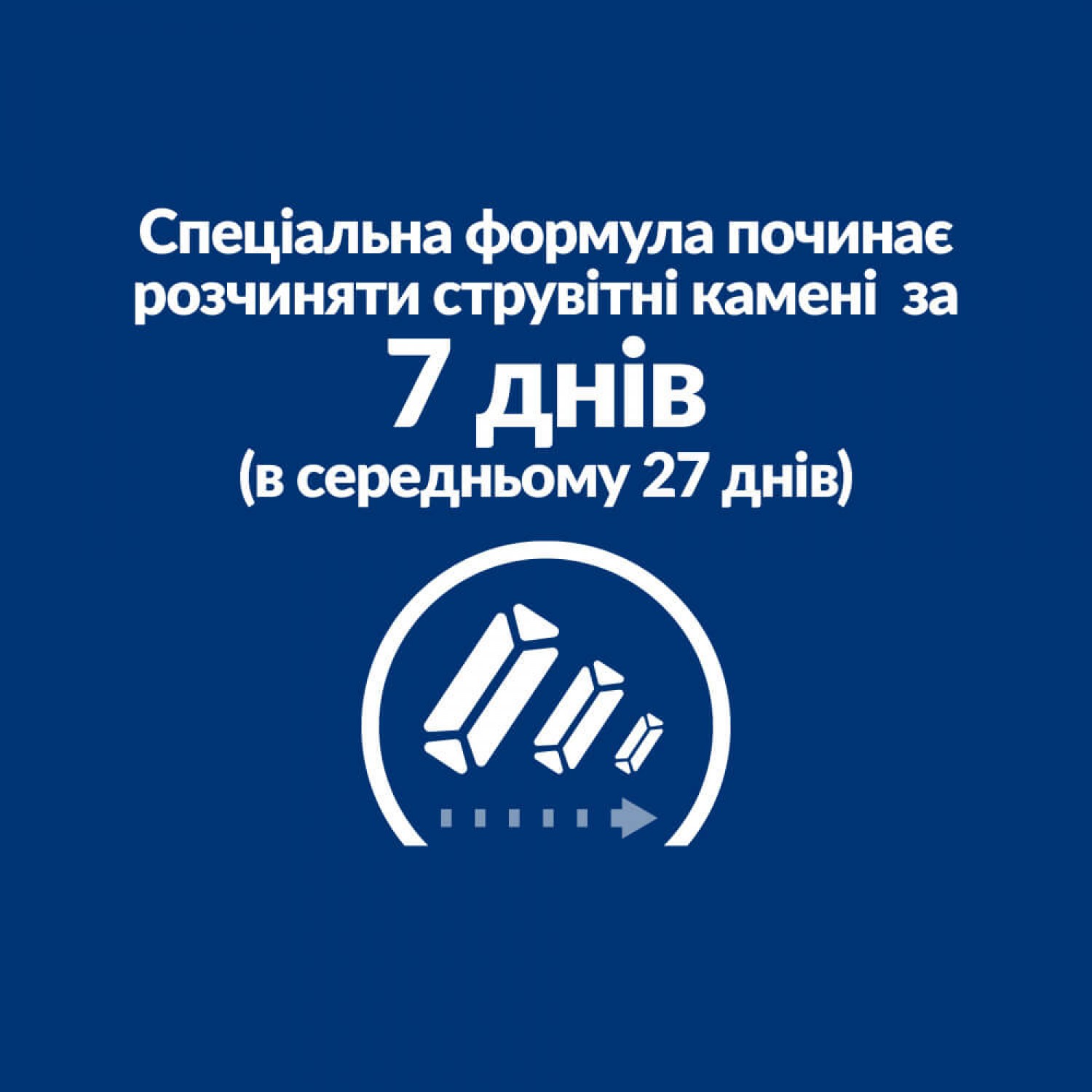 - Специальная формула начинает растворять струвитные камни уже через 7 дней потребления корма (средний срок растворения составляет 27 дней)²