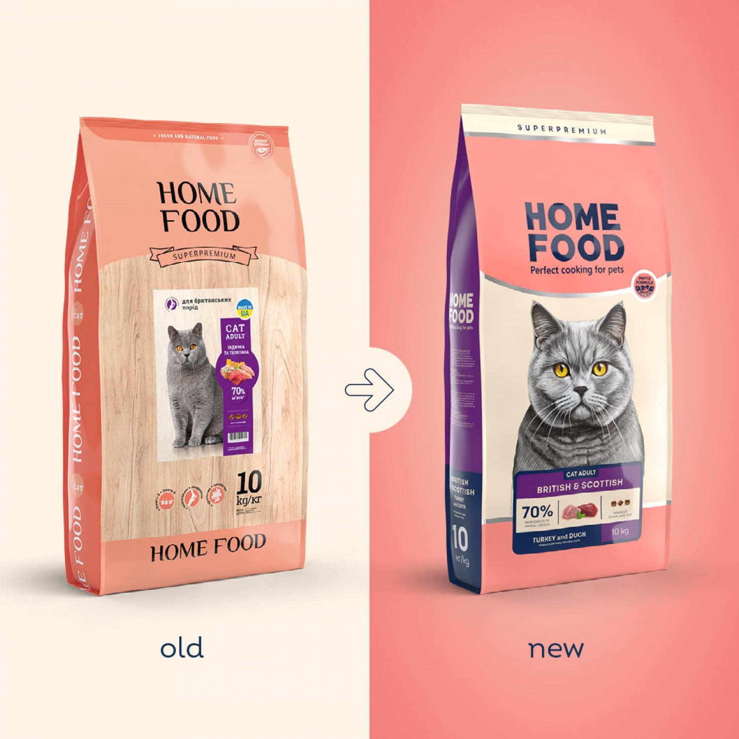 Home Food Cat Adult "Индейка и утка" - сухой корм для кошек британских и шотландских пород. Форма гранул корма специально разработана с учетом физиологических особенностей челюстного аппарата кошек британских и шотландских пород. Подходит также пушистикам больших пород.