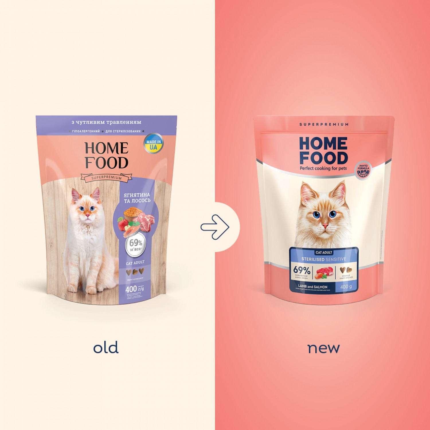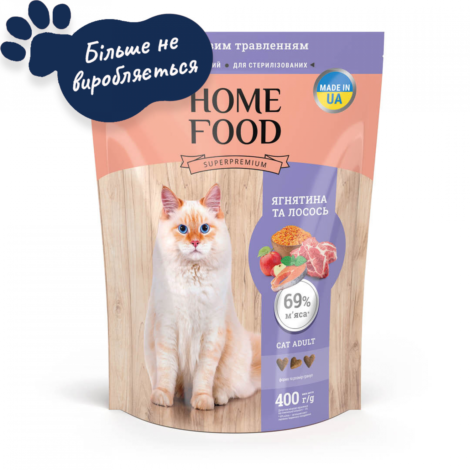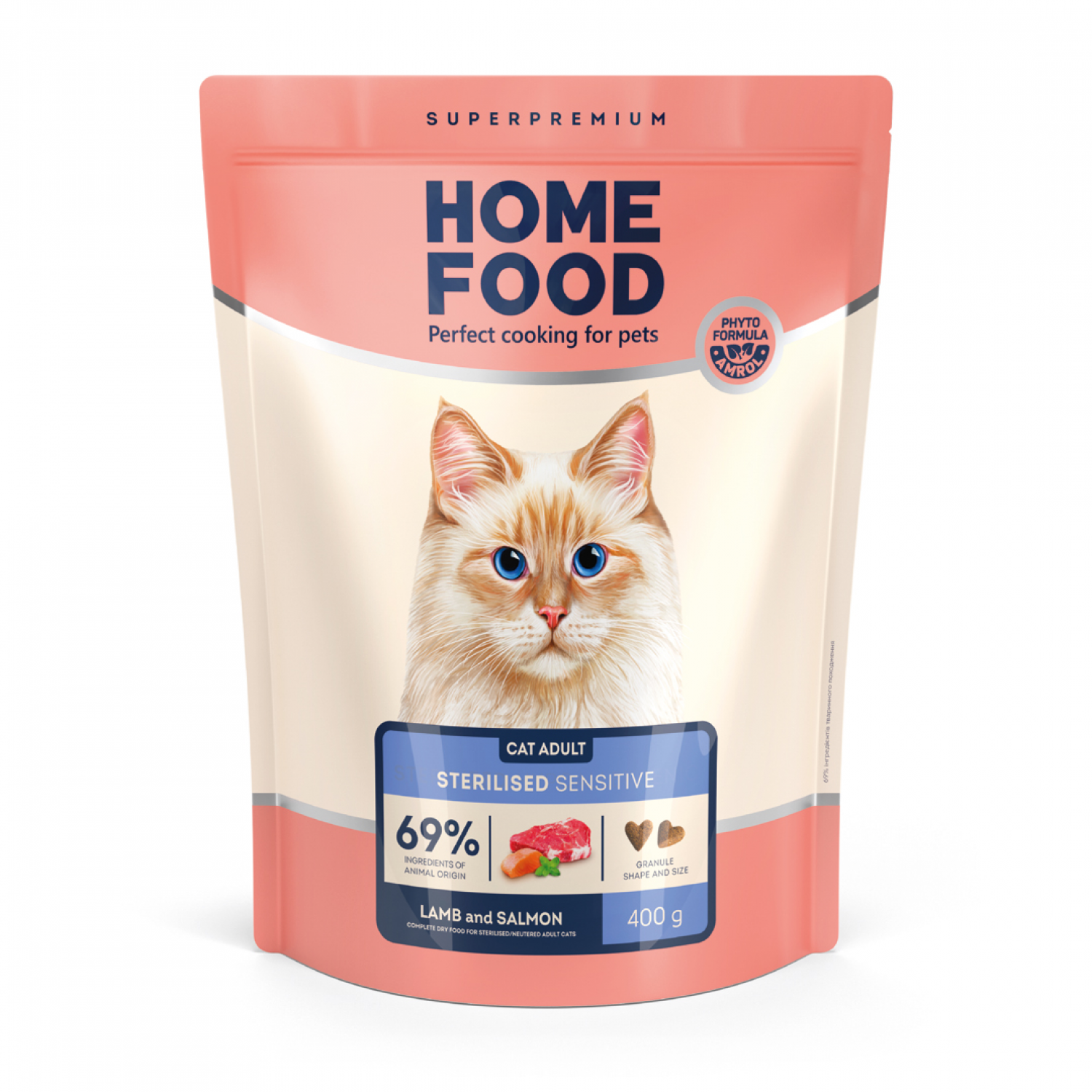 Home Food Cat Adult для стерилизованных кошек с чувствительным пищеварением "Ягнятина и лосось" 0,4 кг