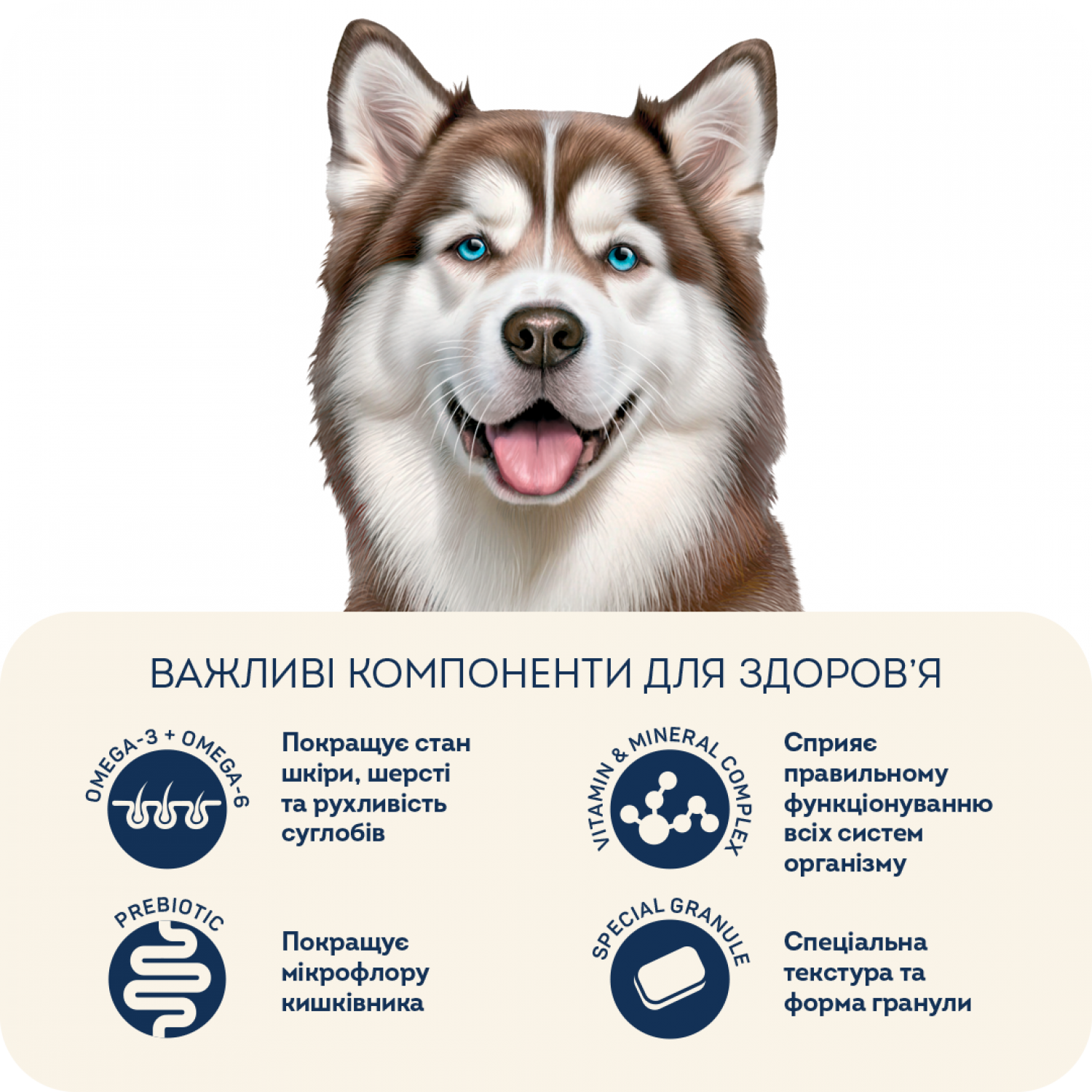 Рецептура разработана специально для крупных пород собак. Идеальный выбор для пород с белым окрасом. Благодаря тщательно подобранной протеиновой группе корм подходит для собак с чувствительным ЖКТ и склонностью к аллергическим реакциям.