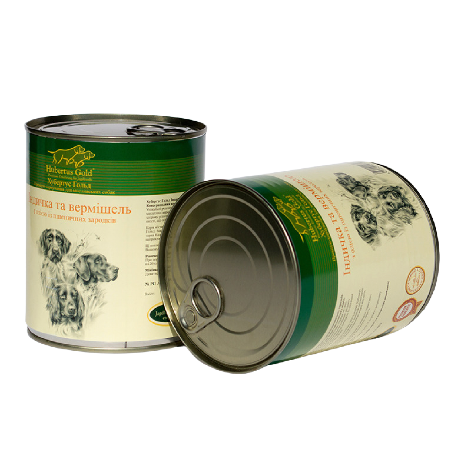 Хубертус Гольд. Индейка и вермишель с маслом из зародышей пшеничного зерна. Консервированный корм премиум класса для собак.