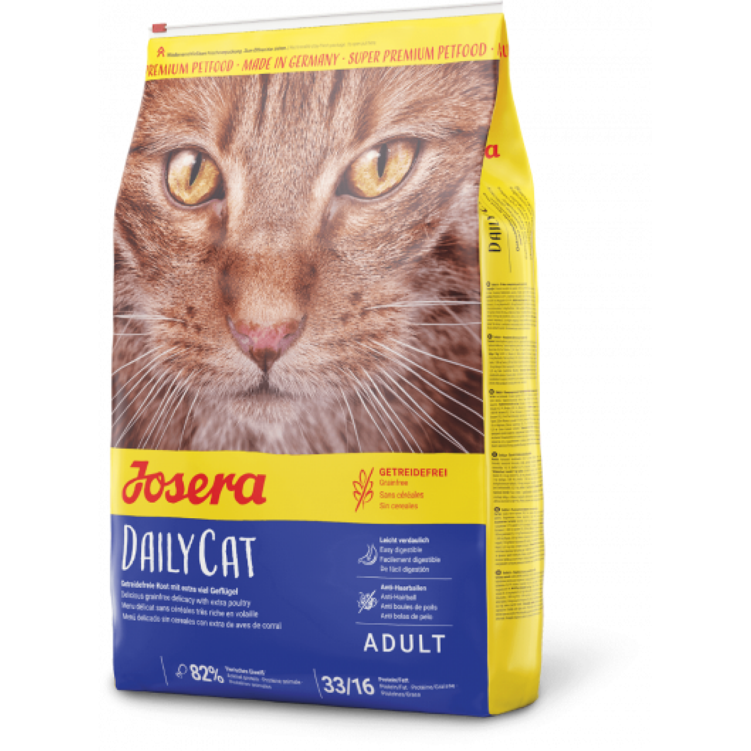 Josera DailyCat - сухой беззерновой корм суперпремиум класса, подходящий для ежедневного питания домашних котов и живущих во дворе. Это ежедневный рацион с мясом домашней птицы, бататом, горохом, травами и фруктами. Дополненный витаминами и минералами, этот корм обеспечит кота необходимым количеством питательных веществ и, благодаря отличным вкусовым качествам, не оставит равнодушным даже самых требовательных питомцев.