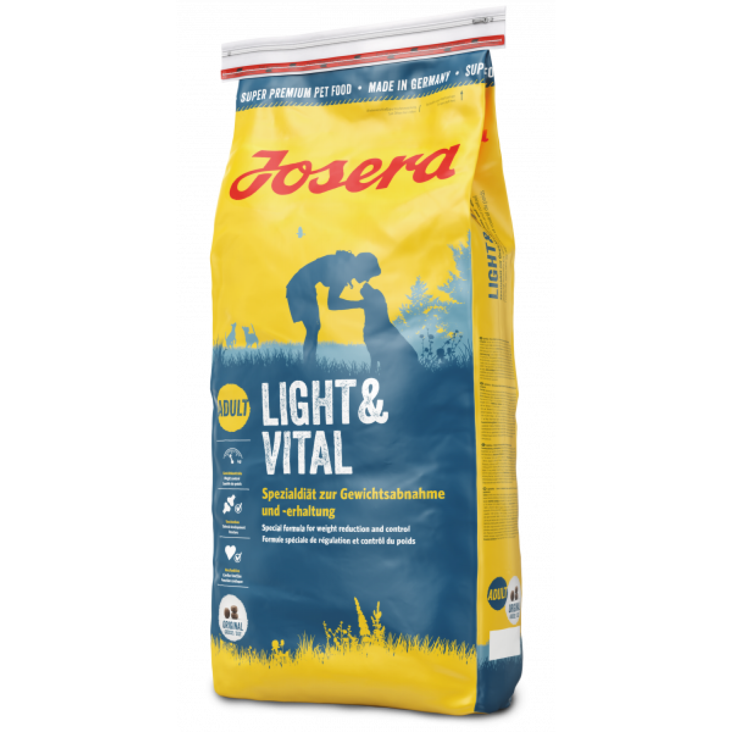 Josera Light & Vital – сухой корм суперпремиум класса для собак, которые склонны к набору избыточного веса или которые должны снизить свой вес. Корм содержит ограниченное содержание жира и большую часть балластных веществ, обусловливающих меньшее содержание калорий, но, тем не менее, насыщает животное. L-карнитин и таурин поддерживают функцию сердца и продлевают жизнь собаки.