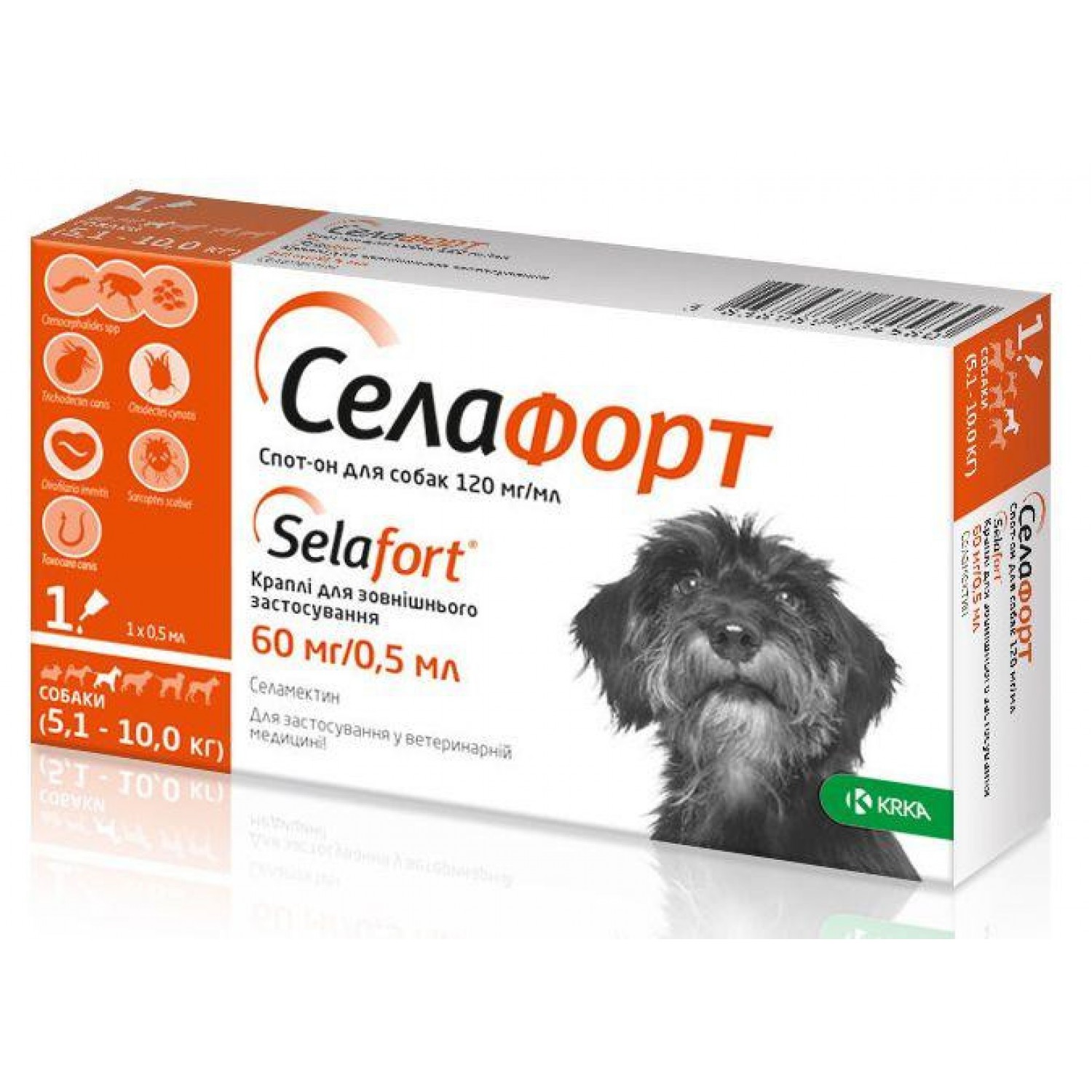Селафорт для собак от 5,1 до 10 кг предназначен для одновременной защиты от внешних и внутренних паразитов. Применяется для профилактики и лечения энтомозов, вызванных блохами, вшами и волосоидами, отодектоза, саркоптоза, а также гельминтозов (анкилостомоза и токсокароза) и профилактики дирофиляриоза (заражение сердечным червем).