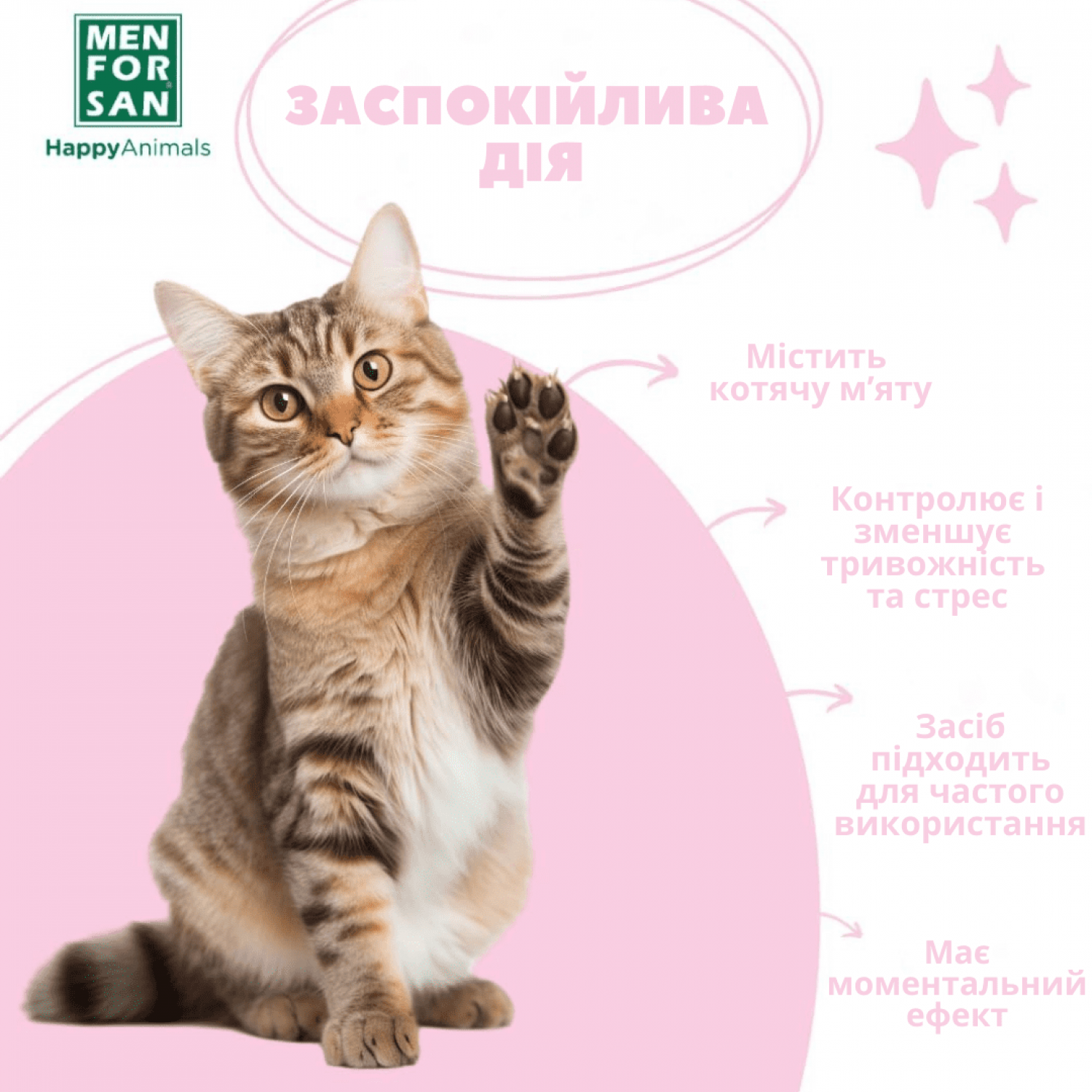 - Помогает снизить симптомы стресса (изменения в поведении, чрезмерный груминг, потеря аппетита, чрезмерное царапание, агрессия, вялость, чрезмерное мяуканье).