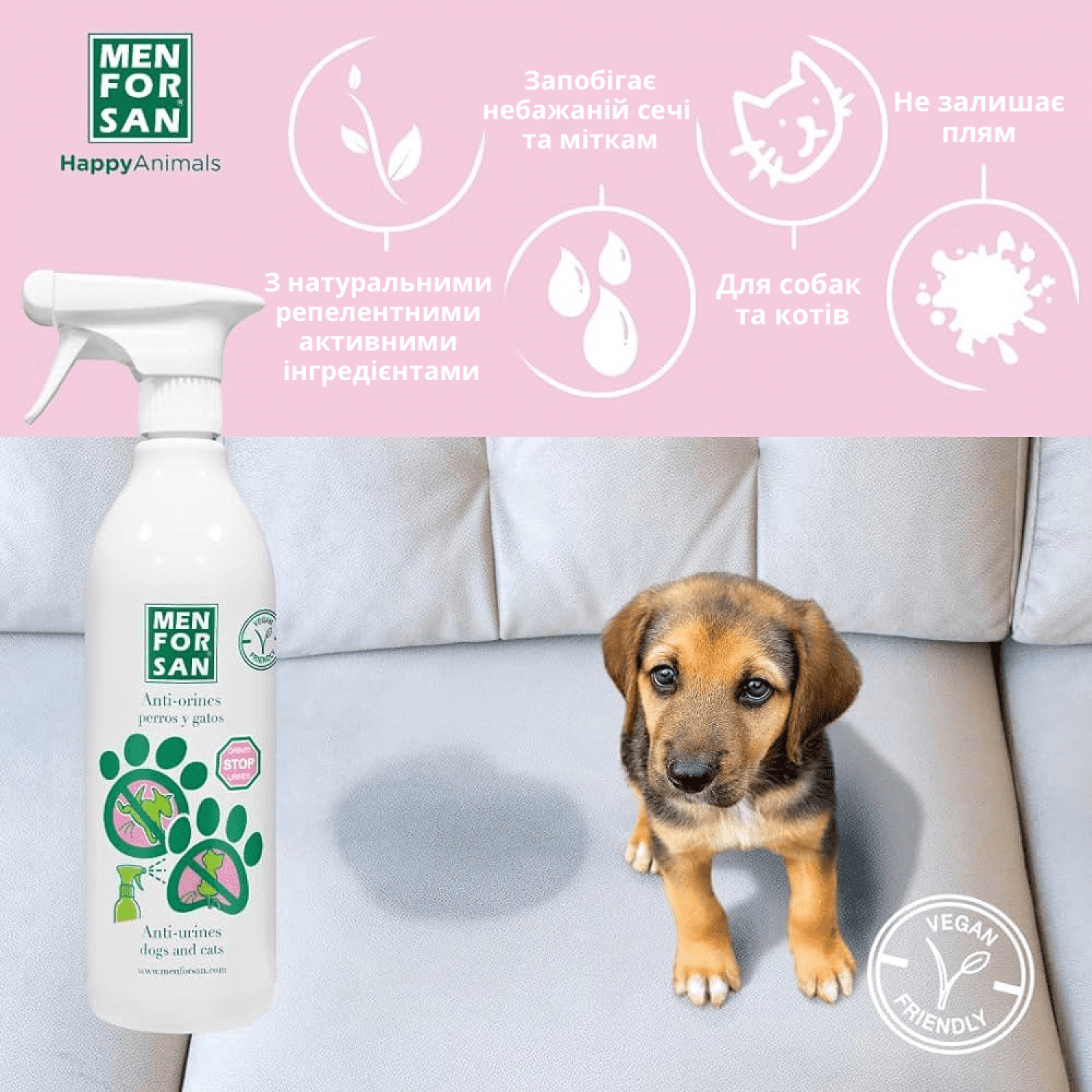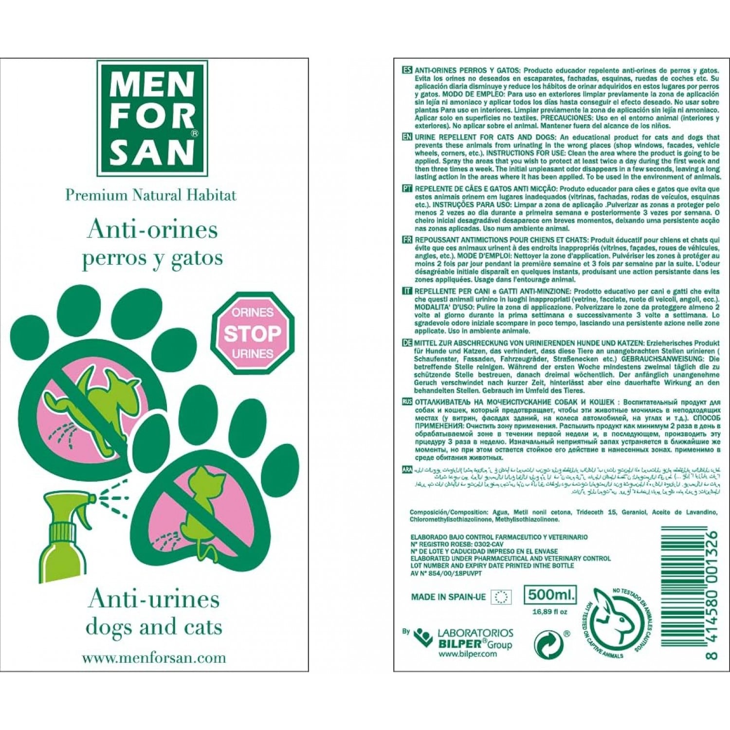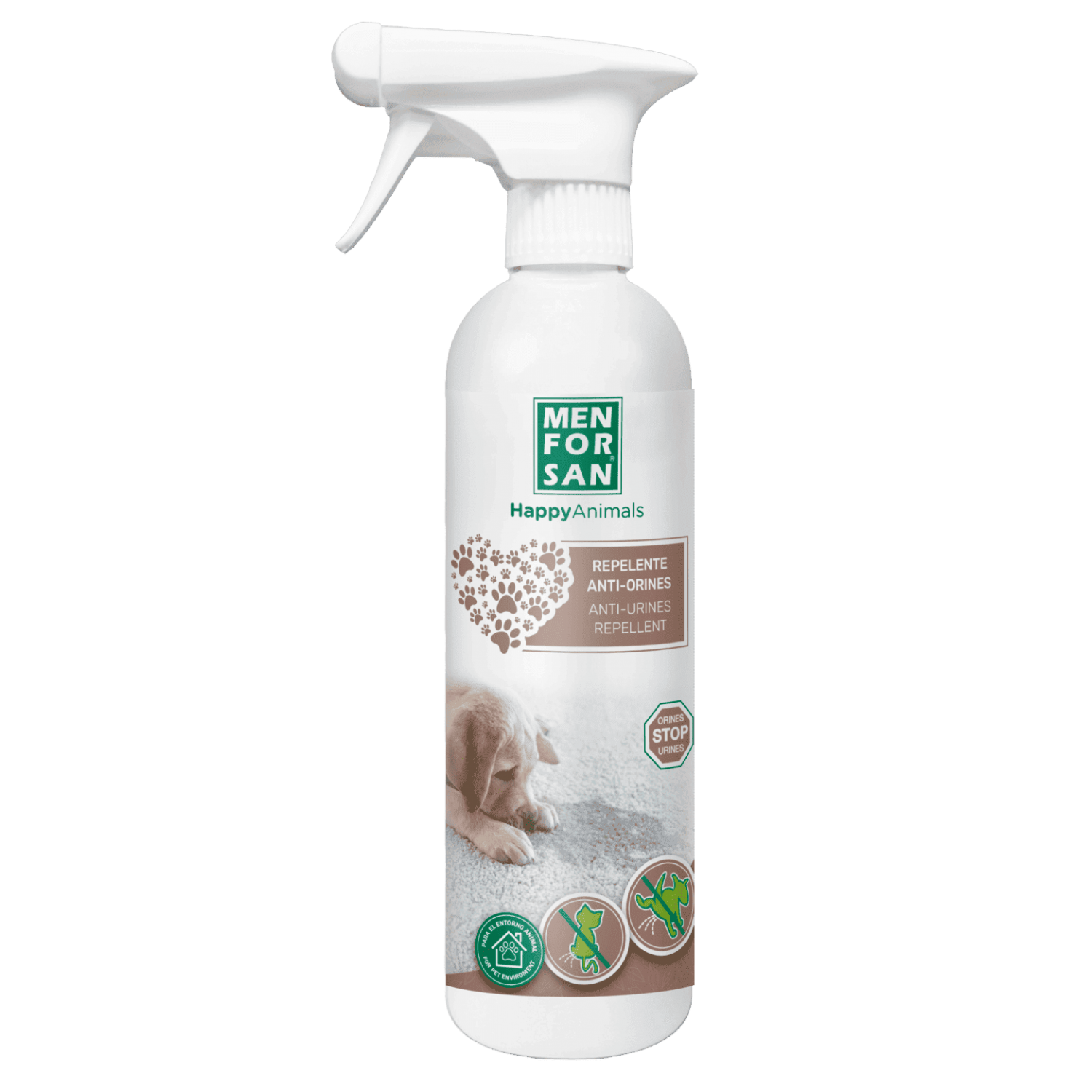 Натуральный, антиуринорепеллентный спрей для воспитания собак и кошек. Этот спрей используется во избежание нежелательной мочи на витринах, фасадах, углах, колесах автомобилей. Ежедневное применение уменьшает привычки мочеиспускания, приобретенные в этих местах собаками и котами.