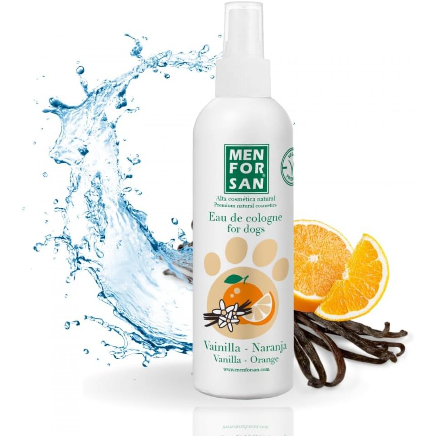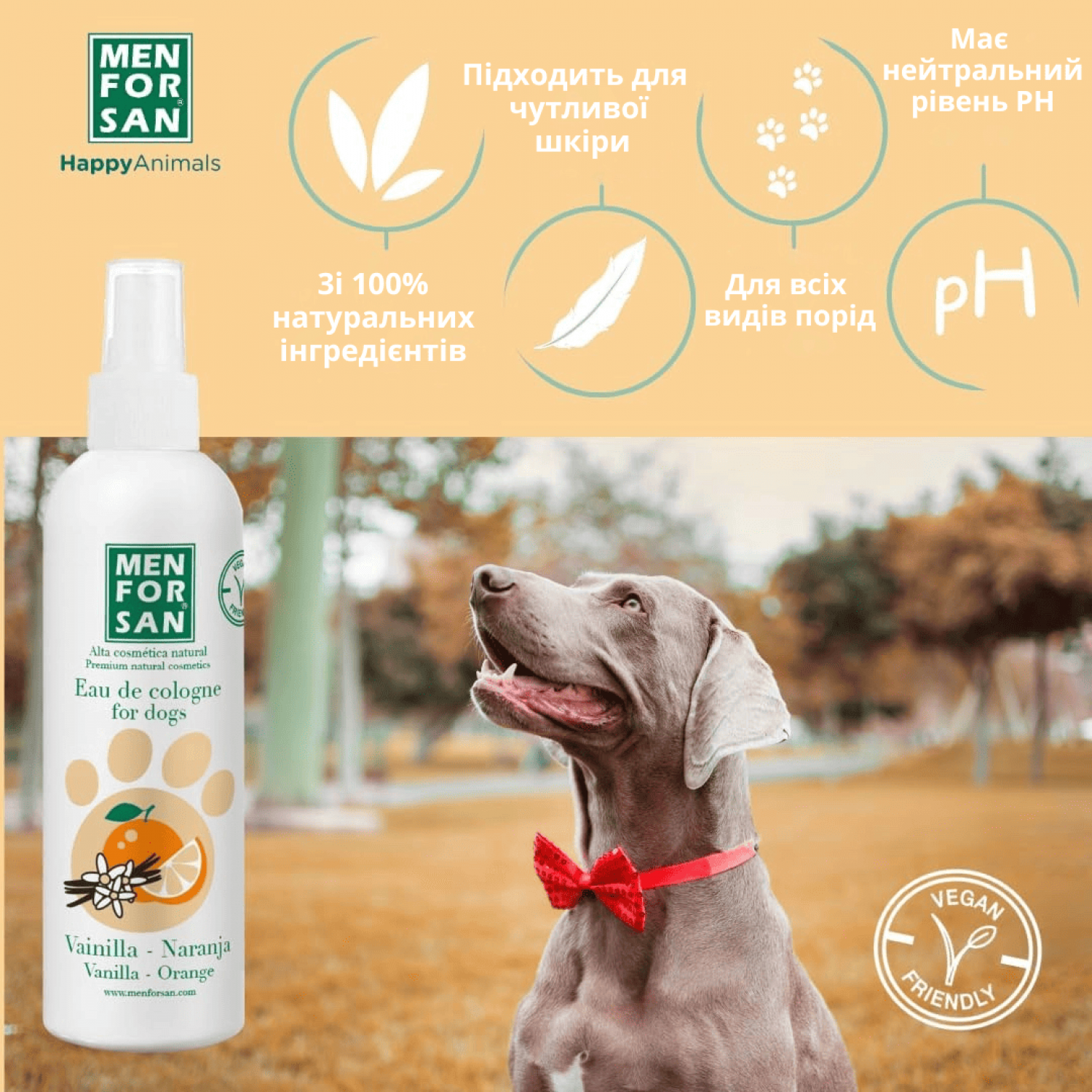 Натуральный одеколон для собак с ароматом ВАНИЛИ и АПЕЛЬСИНА, созданный специально для свежего запаха после купания и интенсивного дезодорирующего эффекта, который очень приятный, сохраняя при этом кожу и обонятельные свойства животного.
