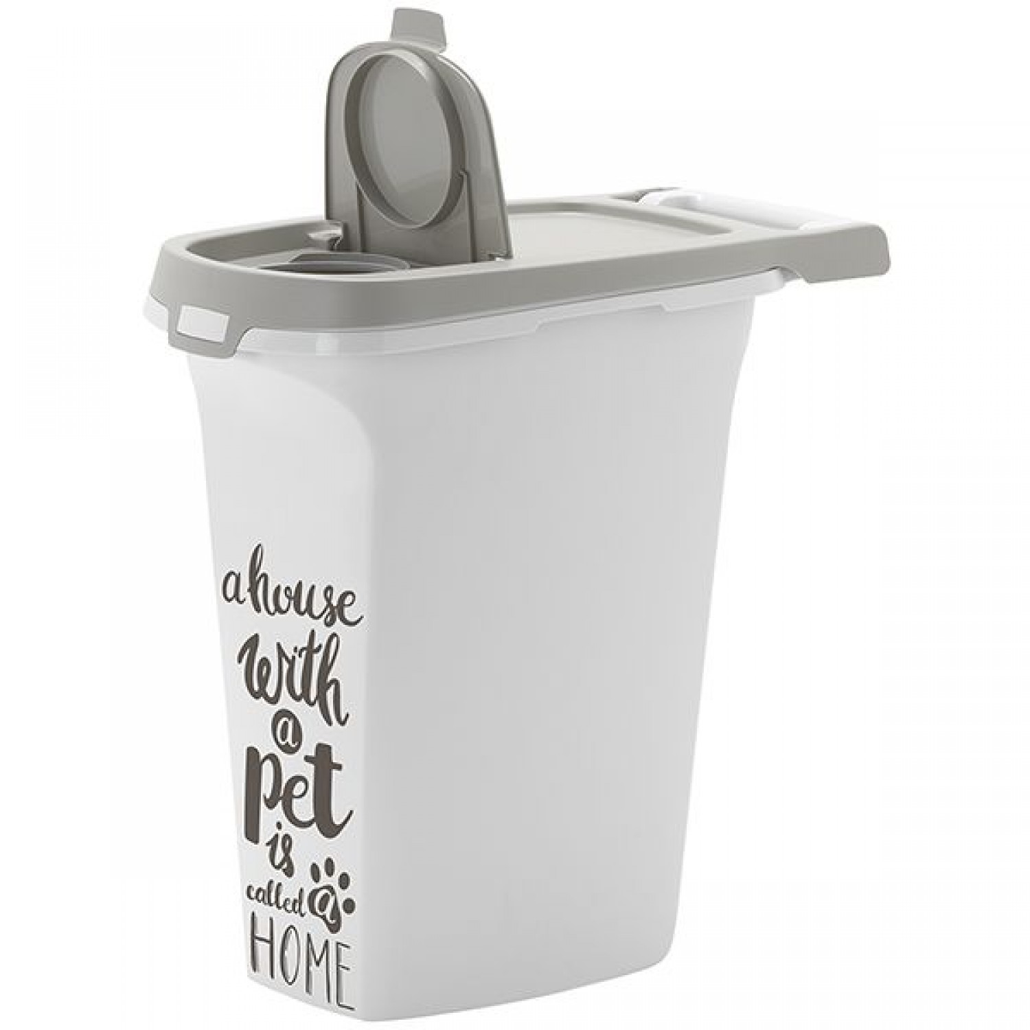 Модель предлагается в 5 вариантах объема: 5, 6, 10, 20, 38 л. В контейнерах объемом 5, 6 и 10 литров откидная крышка имеет 2 уровня открытия: полное вертикальное для заполнения контейнера кормом и небольшое для ежедневного использования. Все крышки фиксируются защелками.