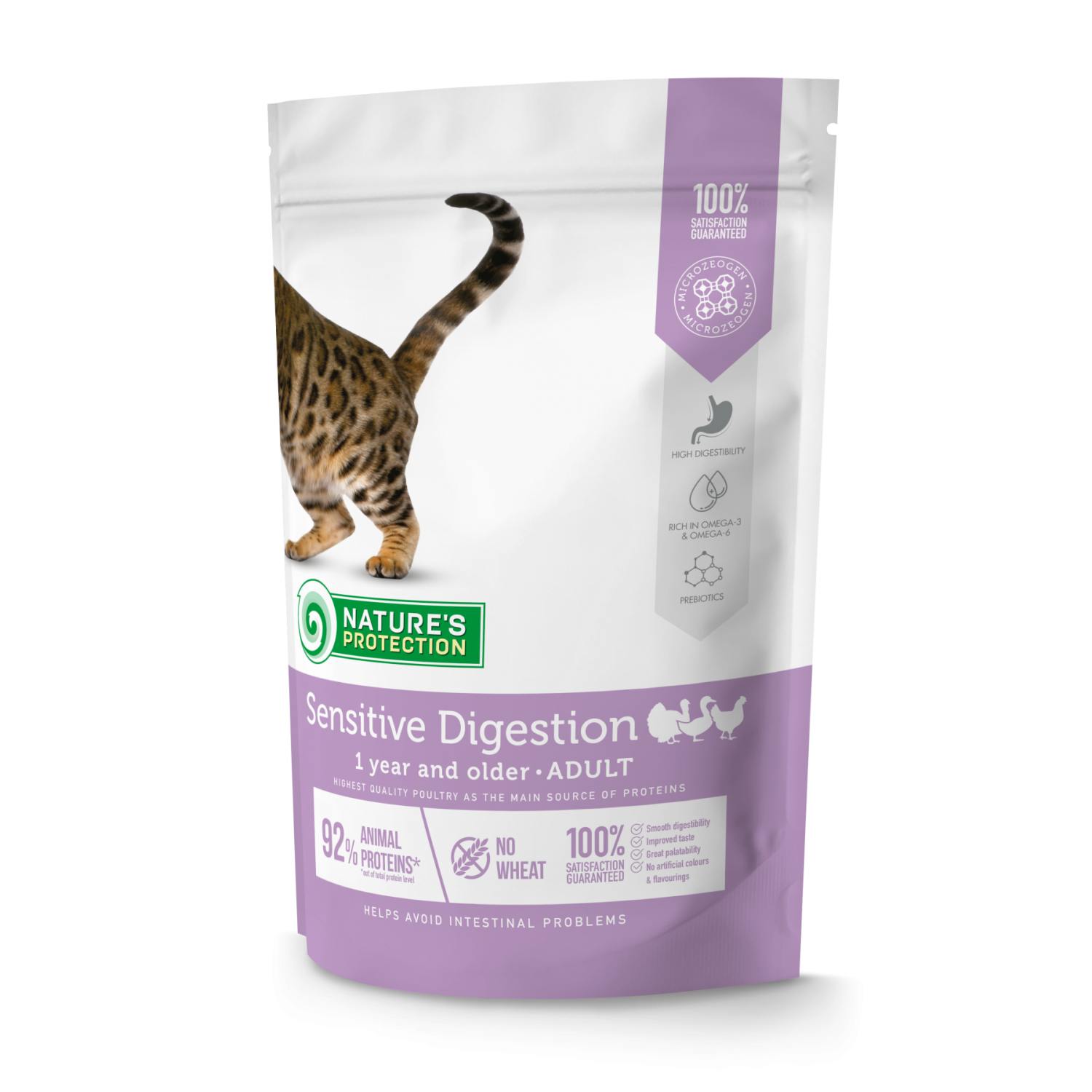 Nature's Protection Sensitive Digestion Adult – полнорационный, сбалансированный сухой корм для взрослых кошек (от 1 года и старше), улучшающий работу желудочно-кишечного тракта. Легкоусвояемый корм имеет приятный для животных вкус. Оптимальное сочетание животных белков и углеводов (картофель, ячмень) способствует легкому пищеварению. Экстракты растений, пищевые добавки и натуральные пищевые волокна также улучшают работу желудочно-кишечного тракта питомца. Корм не содержит генетически модифицированных продуктов и искусственных красителей.