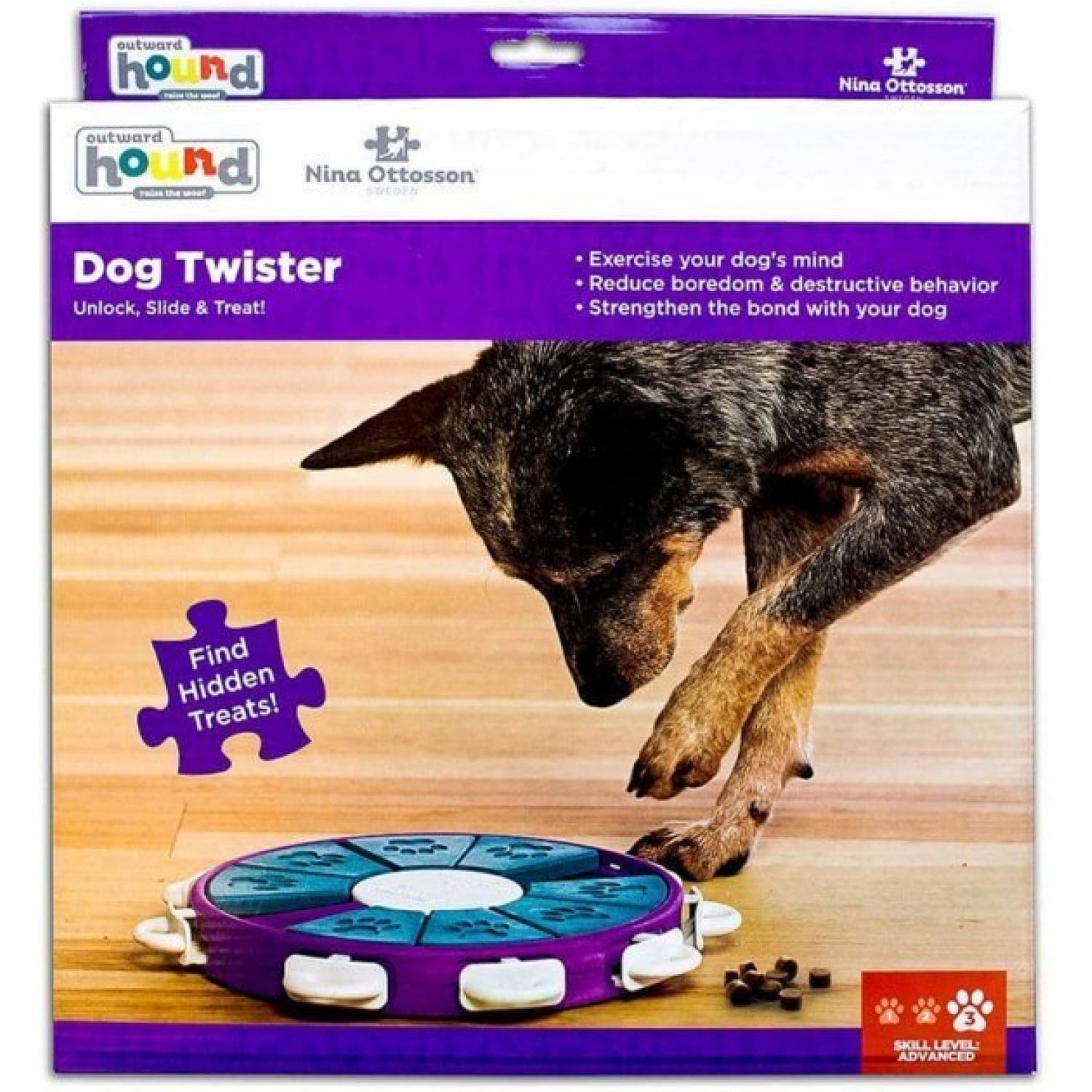 - Представляет собой более сложную головоломку, нежели типичные игры с отделениями для лакомств, в отличие от них Твистер имеет много интересных преград и любопытных опций для интеллектуальной стимуляции, умственного развития и обучения собак.