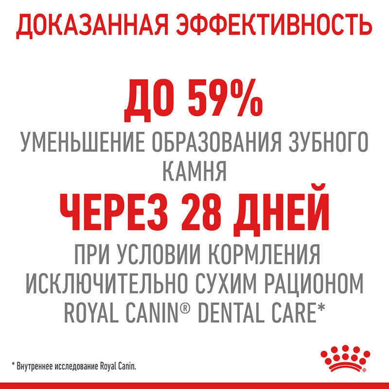 Доказанная эффективность. При кормлении исключительно сухим рационом Royal Canin Dental Care через 28 дней образование зубного камня снижалось до 59%.