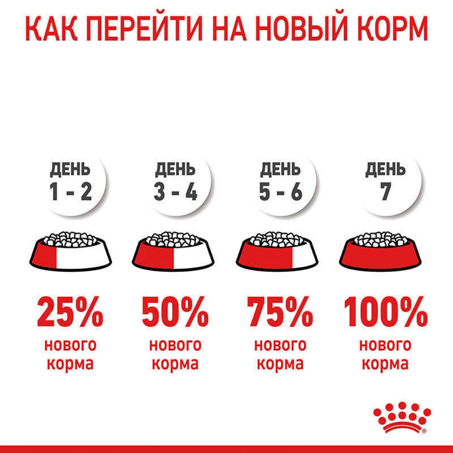 При переходе с одного корма на другой необходимо делать это постепенно. В среднем процесс перехода на новый корм длится 5-7 дней, начиная с незначительного его добавления в привычный сухой корм, заканчивая полной заменой.