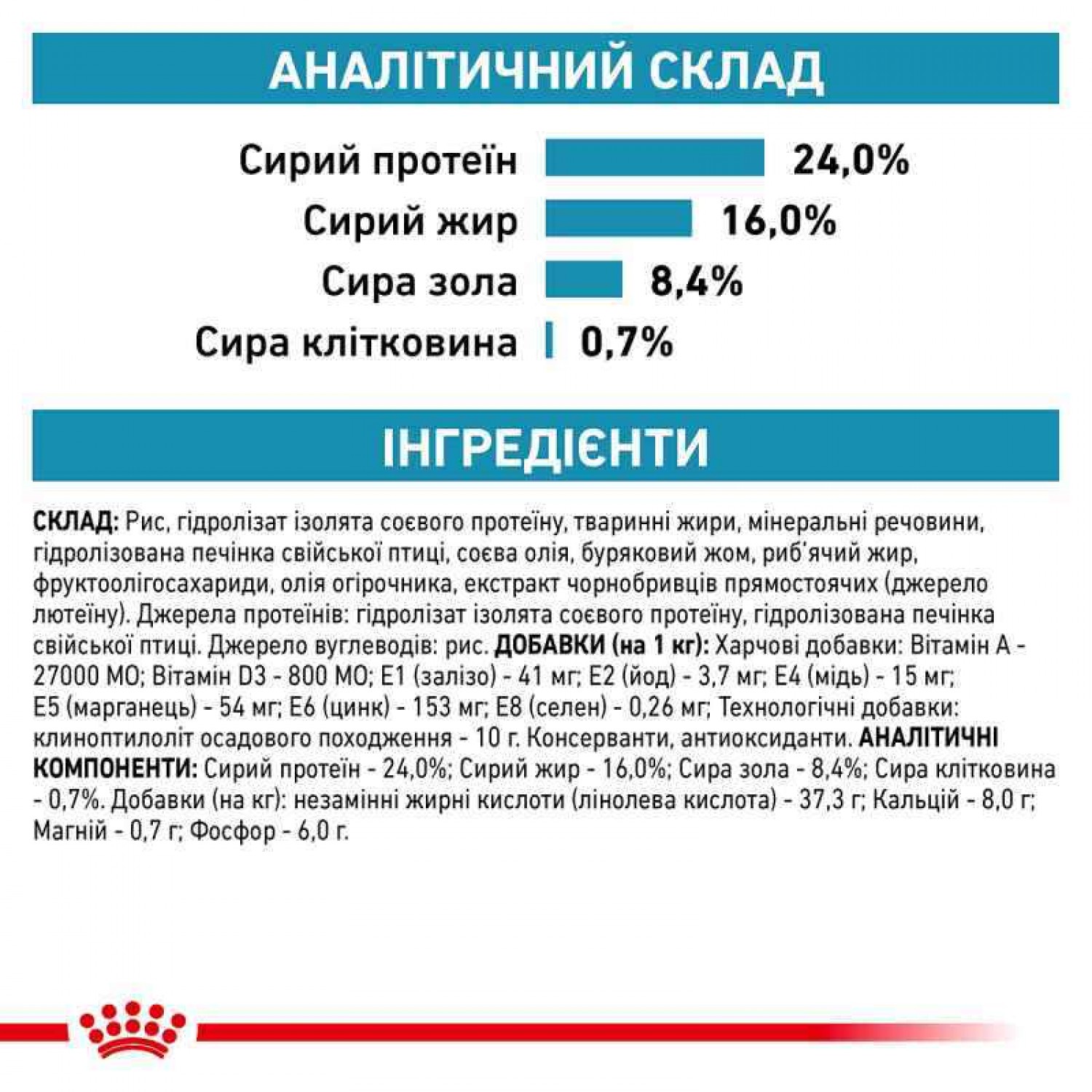 Компанией Royal Canin разработан диетический корм для собак малых пород (весом до 10 кг) при аллергических заболеваниях или собак, страдающих пищевой непереносимостью. Эта диета создана в виде сухого, полнорационного корма и рекомендована для взрослых собак малых пород в возрасте от 10 месяцев и старше. Корм имеет уникальную, тщательно сбалансированную рецептуру, дополненную микроэлементами и витаминами, все питательные компоненты корма отлично усваиваются организмом собаки и обеспечивают его зарядом бодрости и энергии. Эта диета учитывает особенности мочеполовой системы собак мелких пород и предотвращает образование оксалатных и струвитных кристаллов за счет создания неблагоприятной для их формирования флоры.