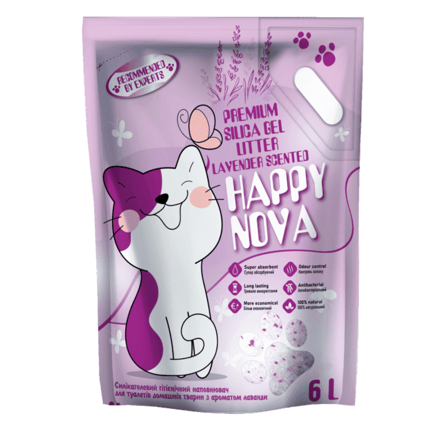 ТМ "Happy Nova" силикагелевый гигиенический наполнитель для туалетов домашних животных с ароматом лаванды.