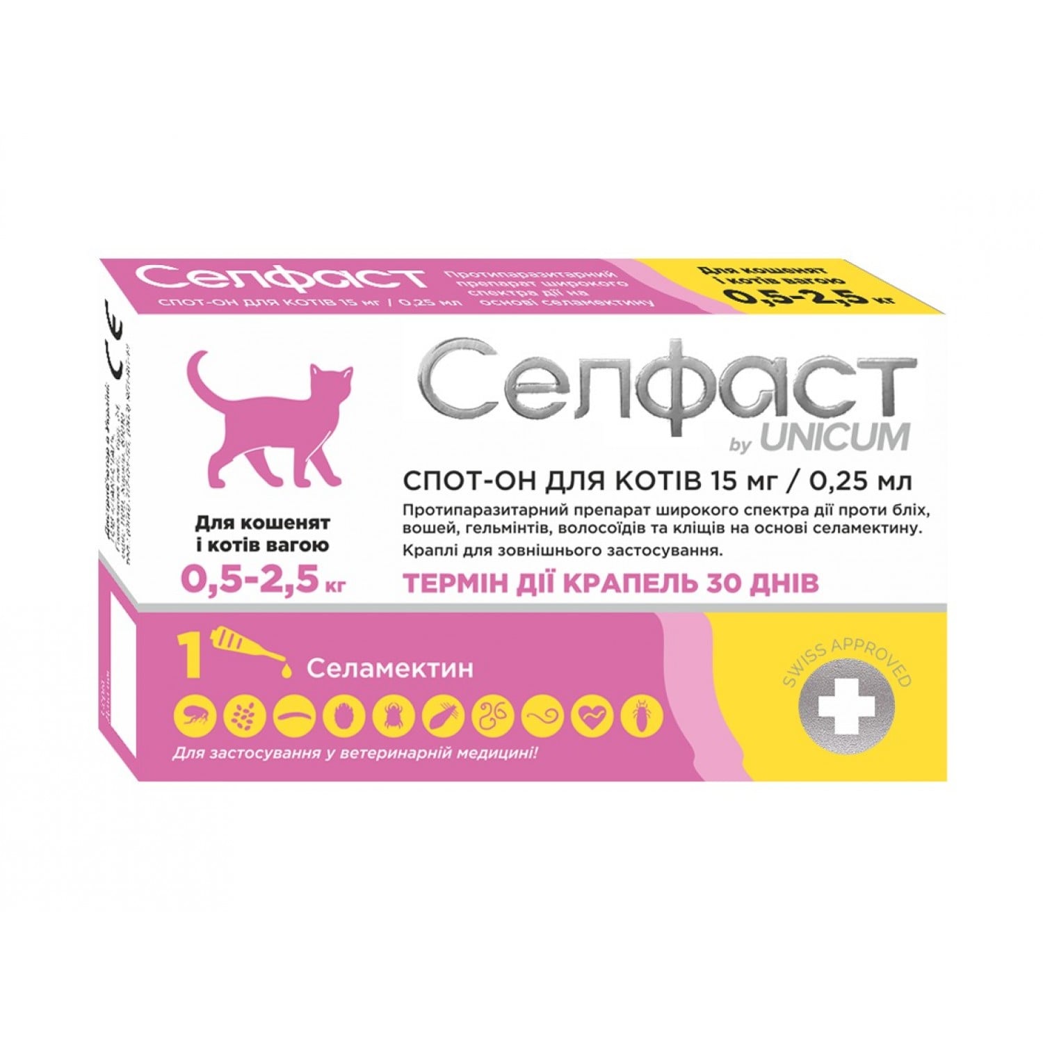 Селфаст Unicum - это противопаразитарное лекарственное средство, предназначенное для кошек. Препарат широкого спектра действия против блох, вшей, гельминтов, волосоидов и клещей на основе селемектина, обладающий широким спектром действия. -токсического или сенсибилизирующего эффекта.