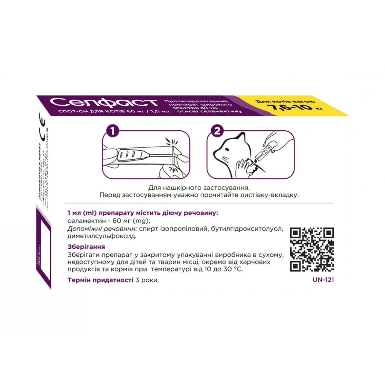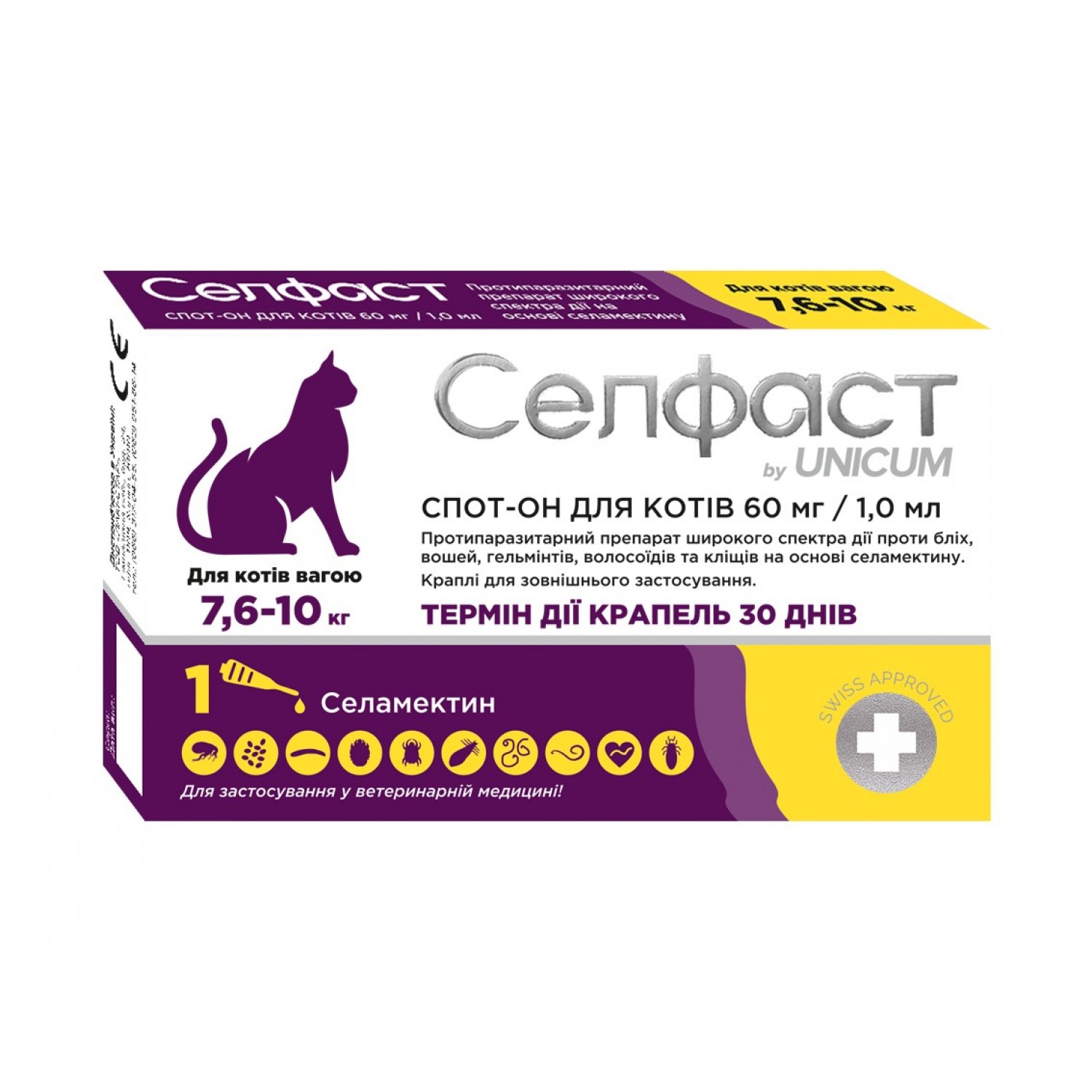 Селфаст Unicum - это противопаразитарное лекарственное средство, предназначенное для кошек. Препарат широкого спектра действия против блох, вшей, гельминтов, волосоидов и клещей на основе селемектина, обладающий широким спектром действия. -токсического или сенсибилизирующего эффекта.