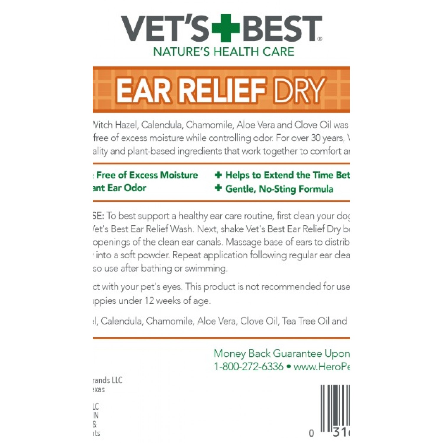 Средство для ухода за ушами собак Vet's Best Ear Relief Dry содержит комплекс из масла чайного дерева, ромашки и эхинацеи, разработанный специально для бережной очистки, успокоения и устранения зуда, раздражений, покраснений, опрелостей и загрязнений.