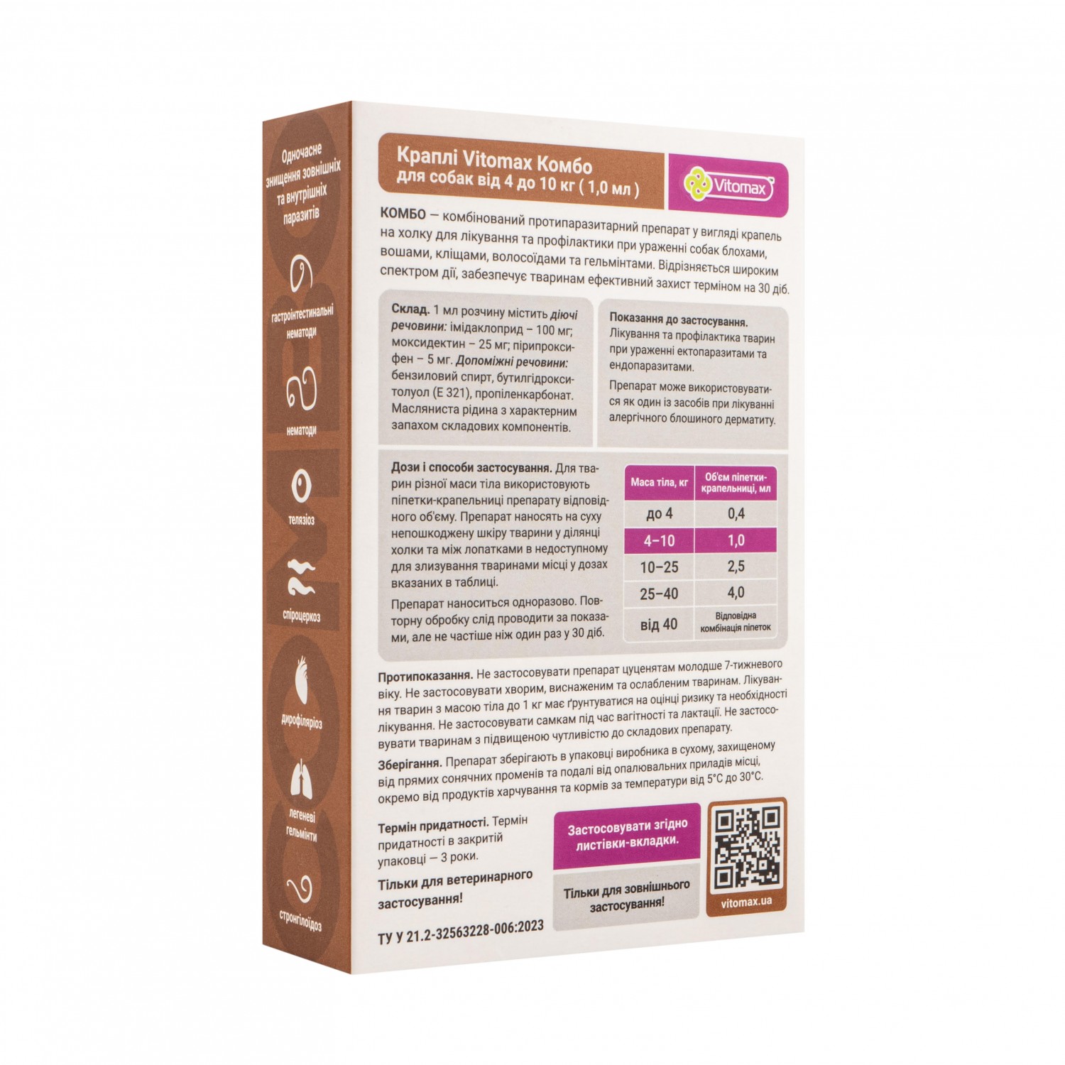 Капли Vitomax Combo для собак от 4 до 10 кг-это эндо- и экто-паразитицид местного применения. Применяются для профилактики и лечения животных при поражении блохами, вшами, волосоедами, клещами, нематодами дыхательных путей и гастроинтестинальными нематодами. Используют в комплексной терапии при лечении аллергического блошиного дерматита.