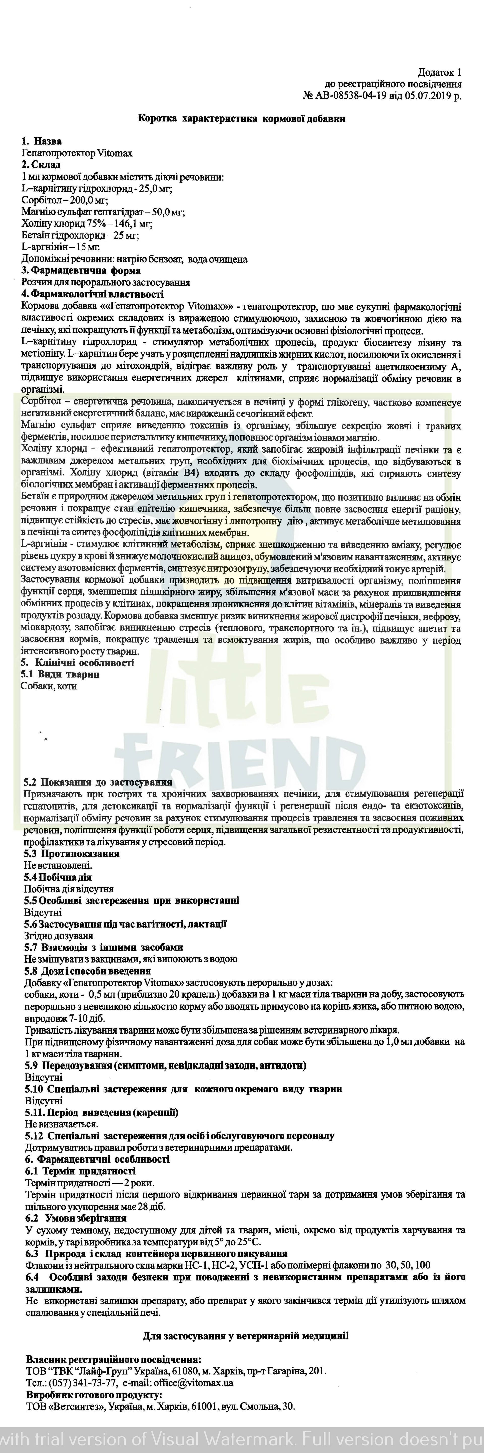 Кормовая добавка «Гепатопротектор Vitomax» - гепатопротектор, что имеет совокупные фармакологические свойства отдельных составляющих с выраженным стимулирующим, защитным и желчегонным действием на печень, которые улучшают ее функции и метаболизм, оптимизируя основные физиологические процессы.