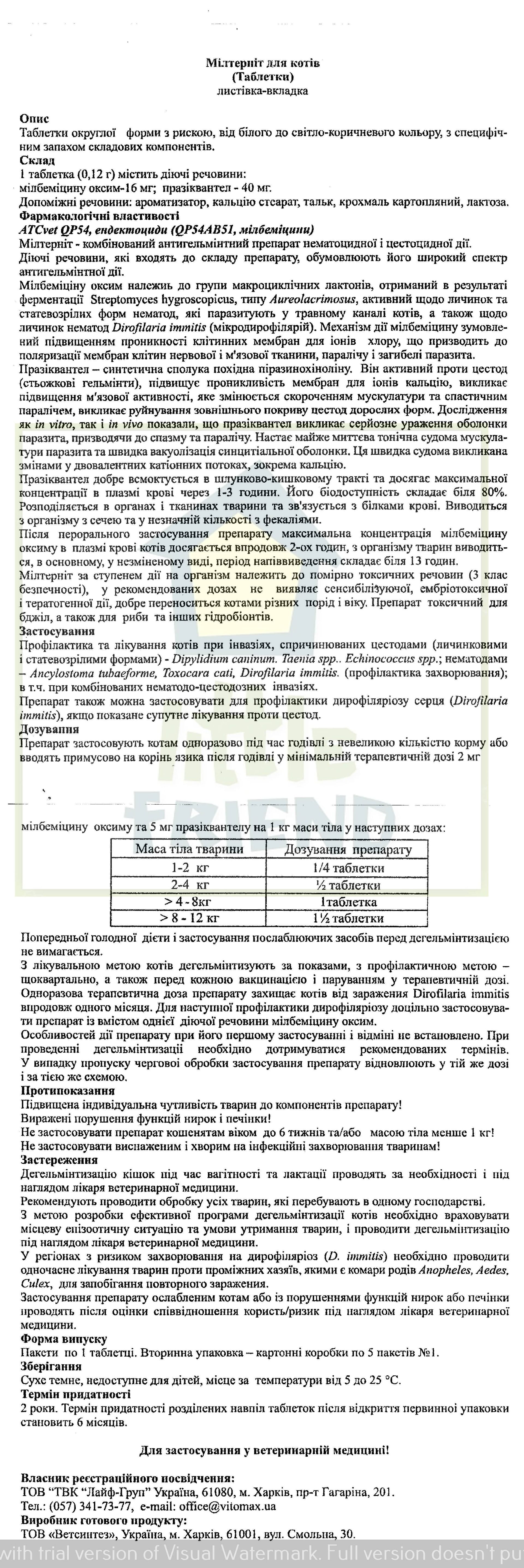 Милтернит — комбинированный антигельминтный препарат широкого спектра действия для профилактики и лечения при нематодозах и цестозах у кошек и котят.