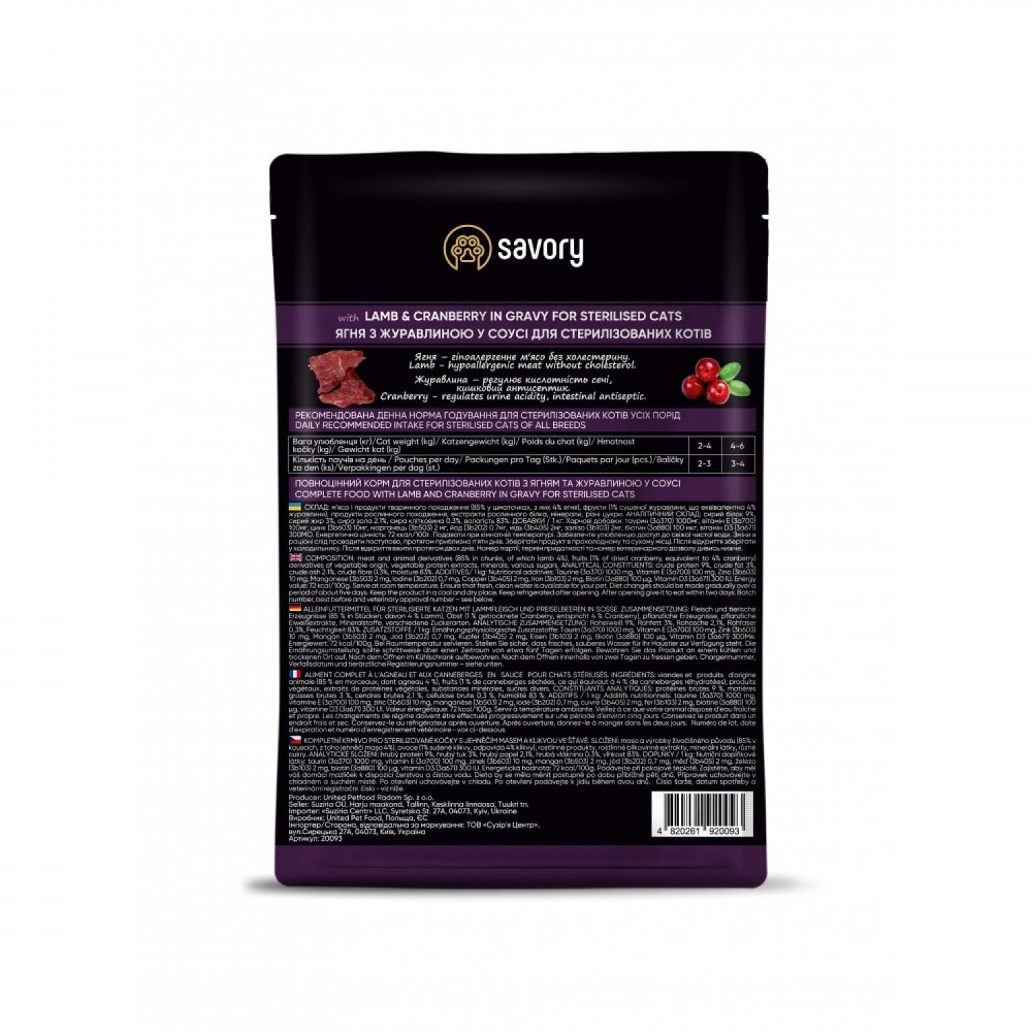 Savory Sterilised Cat Pouch with Turkey & Carrot in Jelly вологий корм для стерилізованих котів з ягням та журавлиною.