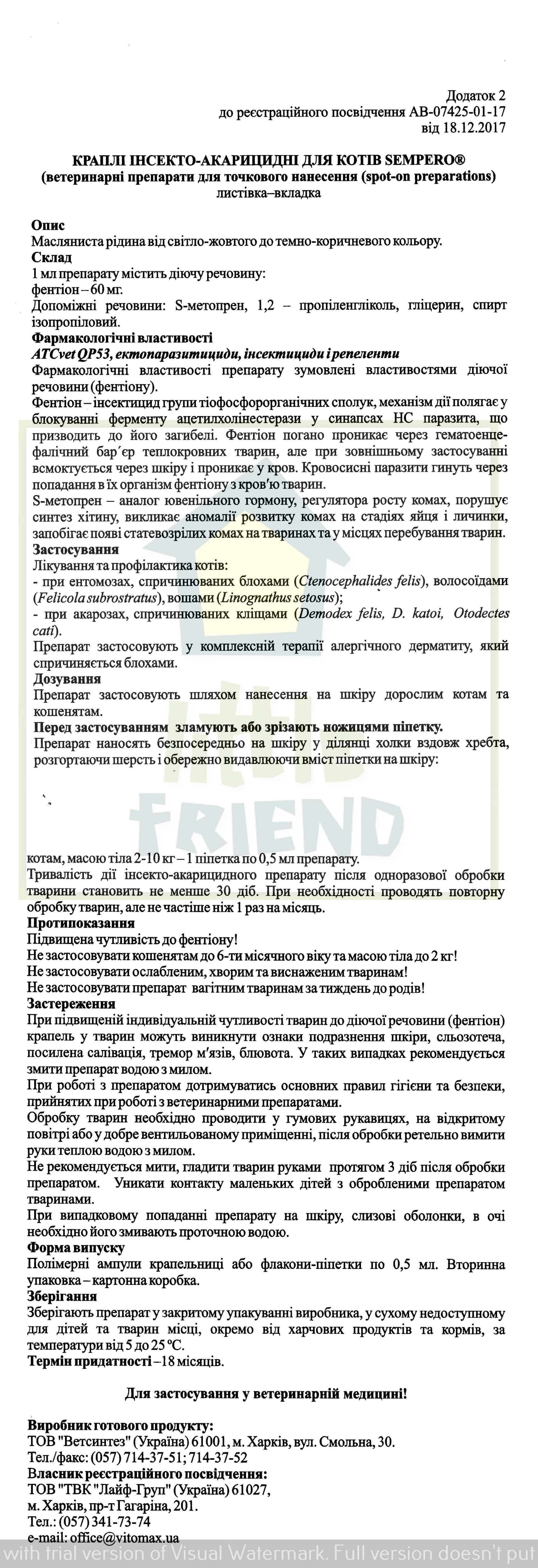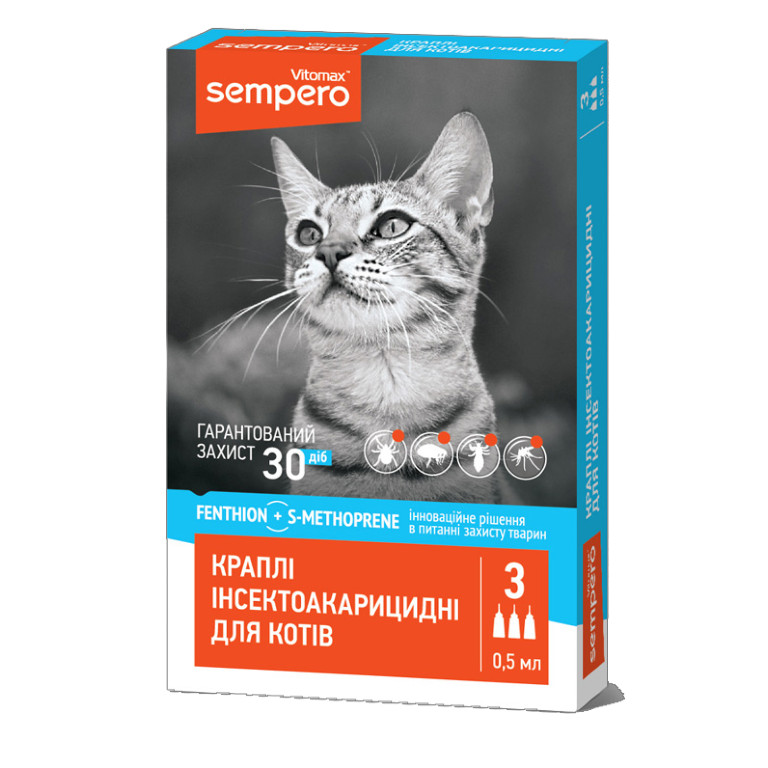 Sempero для котів-інсектоакарицидні краплі нового покоління на основі комбінації діючих речовин Fenthion та S-Methoprene. Гарантований захист від ектопаразитів на всіх стадіях розвитку.