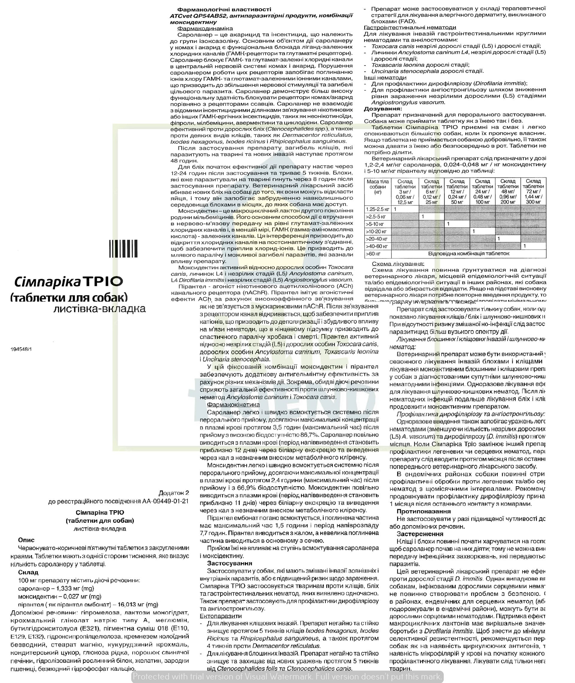Таблетки з трьома активними інгредієнтами для захисту від бліх та кліщів, ангіостронгільозу, дирофiлярiозу та шлунково- кишкових нематод.