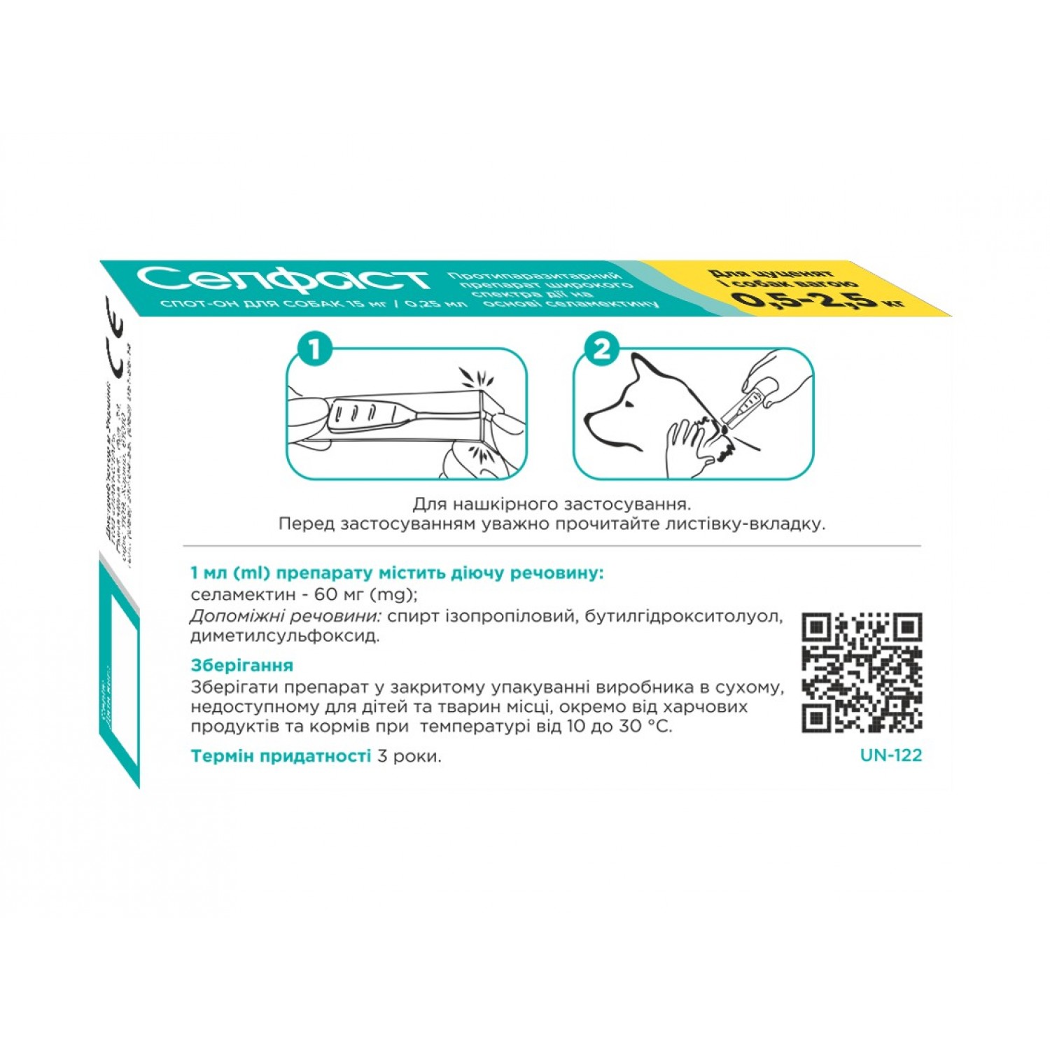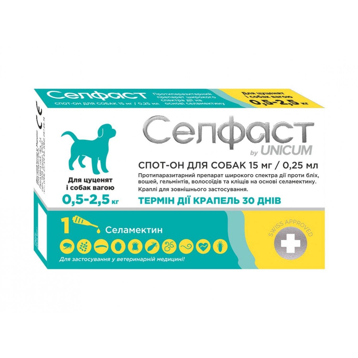 Селфаст Unicum - це протипаразитарний лікарський засіб, призначений для собак. Препарат широкого спектра дії проти бліх, вошей, гельмінтів, волосоїдів та кліщів на основі селемектину, що володіє широким спектром дії. Селфаст Unicum максимально безпечний для тварин (3 клас небезпеки), і в рекомендованих дозах не викликає місцево-дратівливого, резорбтивно-токсичного або сенсибілізуючого ефекту.