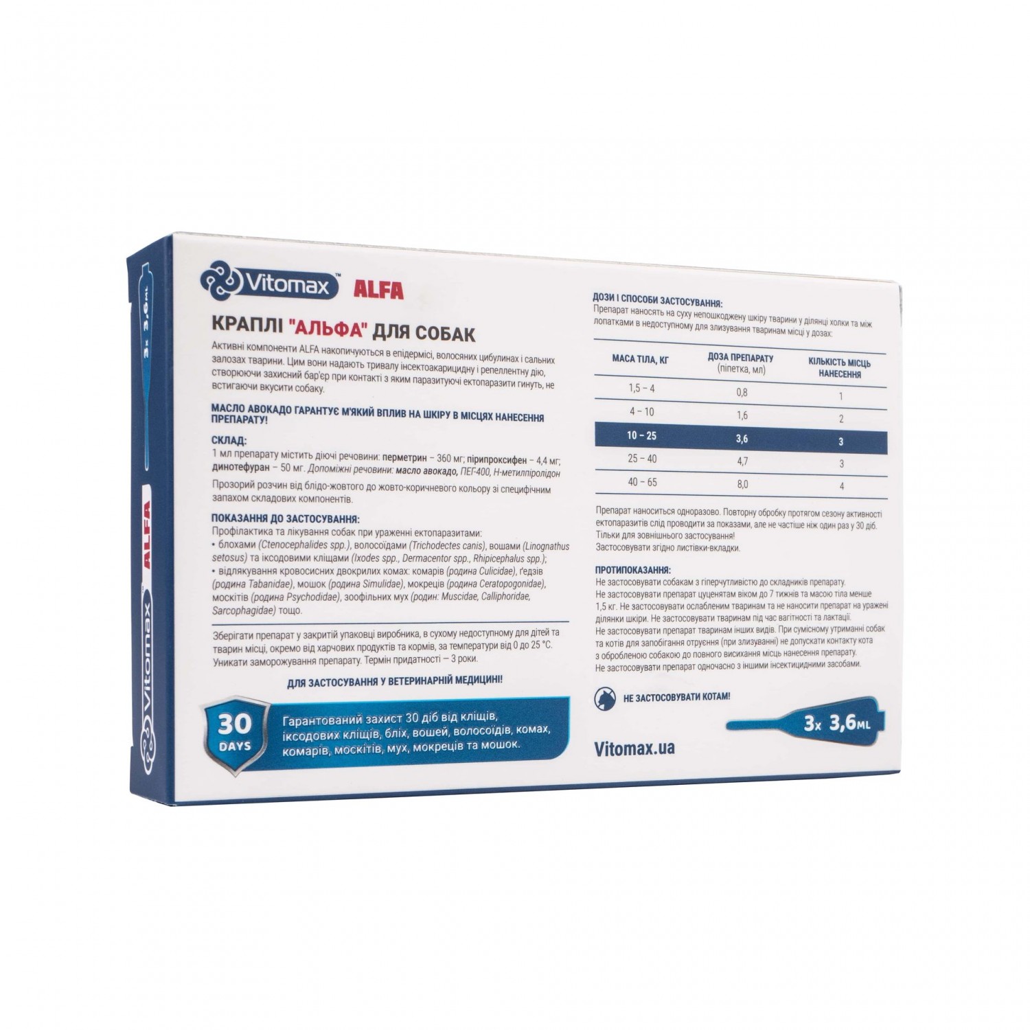 Гарантований захист від кліщів, іксодових кліщів, бліх, вошей, волосоїдів, комах, комарів, мух, мокриць і мошок.