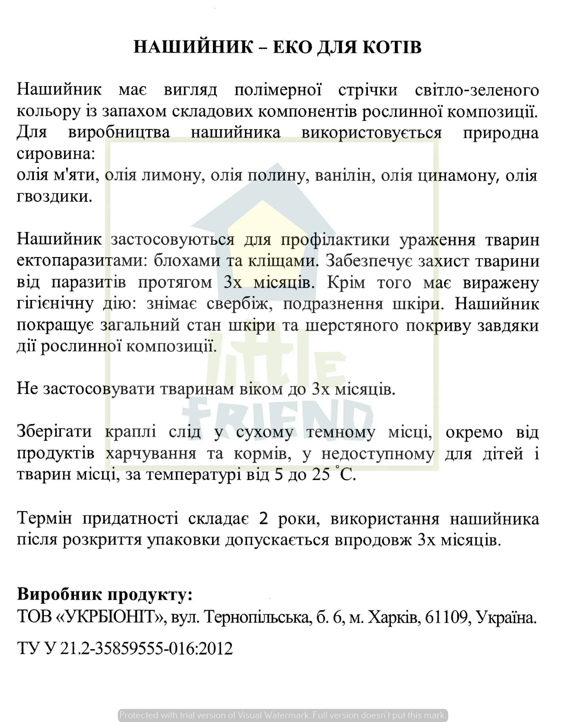 Полімерна стрічка – нашийник світло-зеленого кольору зі специфічним запахом екстрактів рослинних компонентів. Завдяки виключно натуральним інгредієнтам ефективність цього засобу захисту котів перевершує всі очікування. Нашийник від бліх є одним з найбільш ефективних способів захисту домашніх тварин від паразитів.
