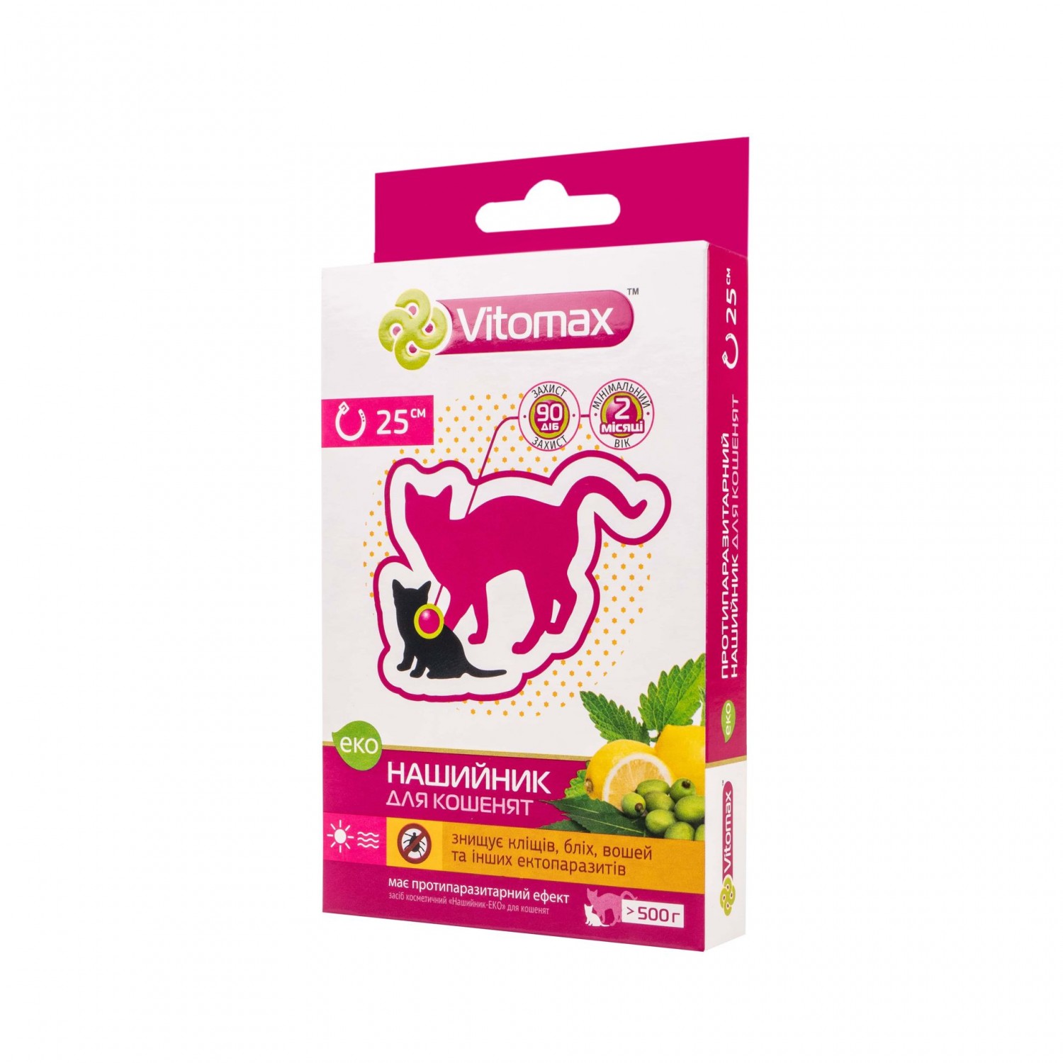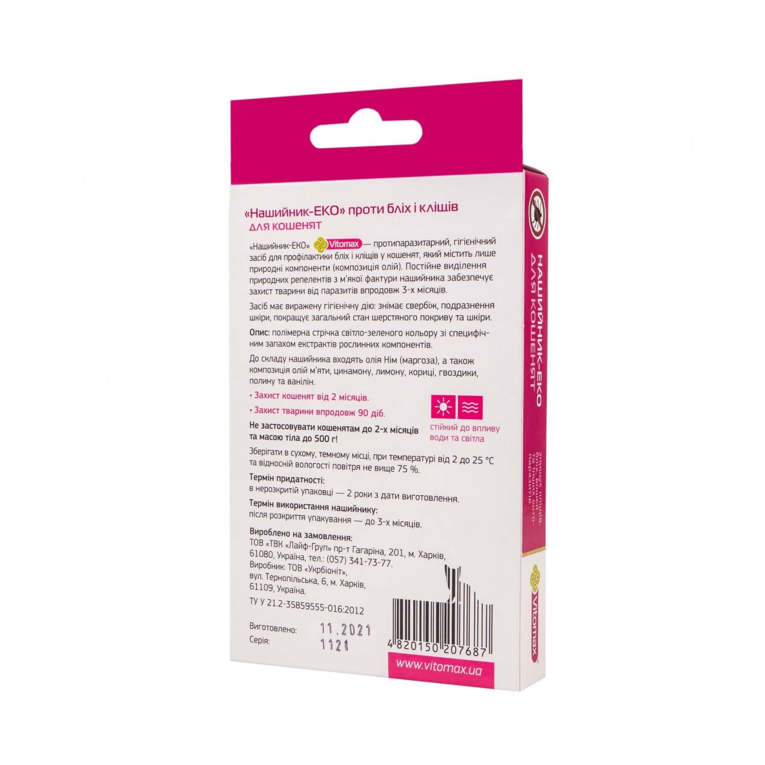 ЕКО нашийник Vitomax для кошенят являє собою вузьку полімерну стрічку світло-зеленого кольору, з запахом рослинних компонентів. Нашийник відлякує ектопаразитів, не дратуючи кошачий нюх.
