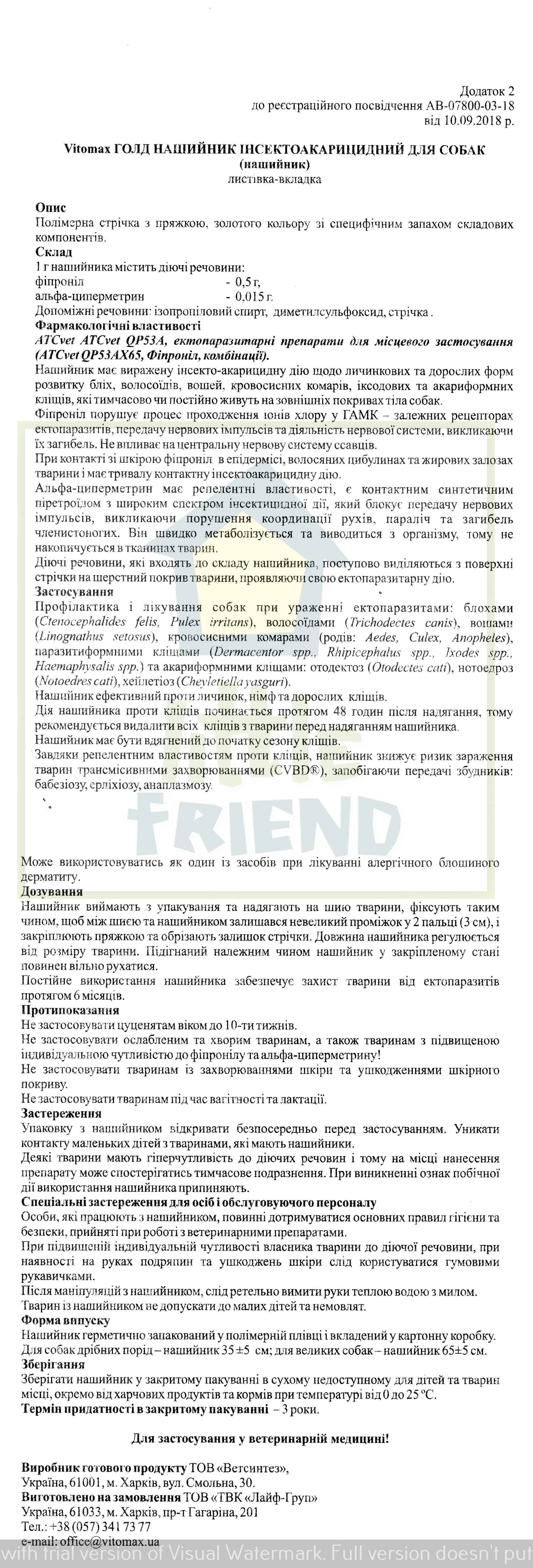 - Нашийник Vitomax Gold забезпечує захист від кліщів, бліх та інших комах протягом 5 місяців. Нашийник має відлякувальну дію на кліщів та інших комах. Знищує паразитів ще до укусу, тим самим зменшуючи ризик зараження тварини небезпечними захворюваннями.