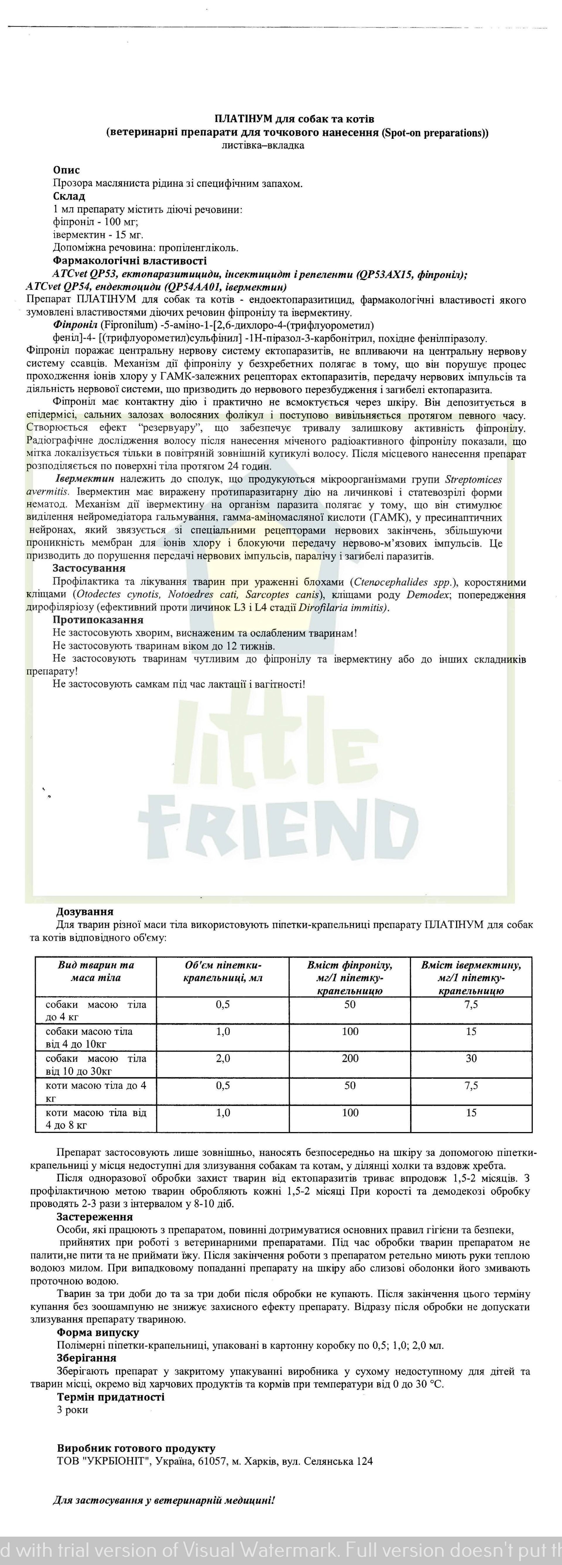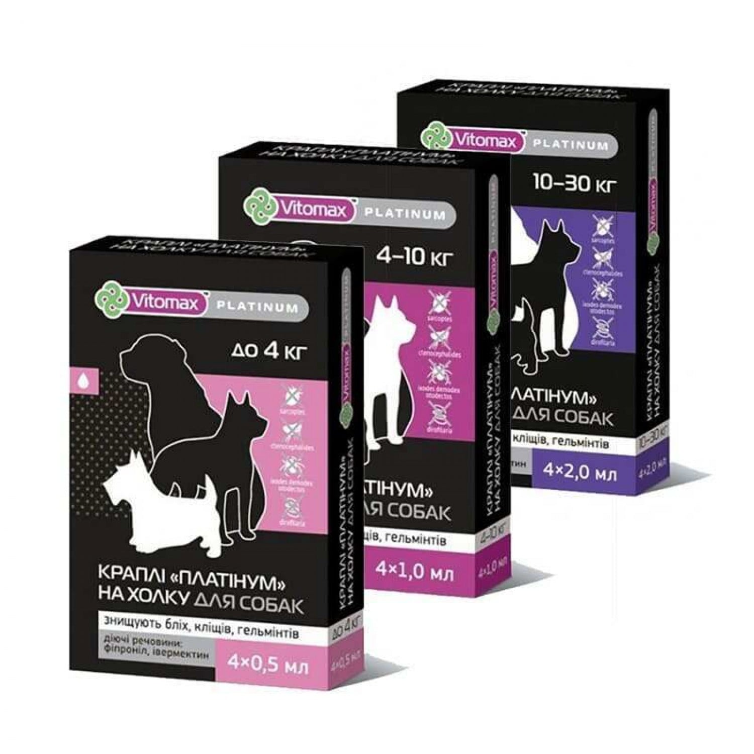 Інсектицидноакарицидний препарат розроблено спеціально для собак великих порід, вагою 10-30 кг. Лінійка протипаразитарних крапель «Платінум» призначена для лікування або профілактики зараження паразитами.